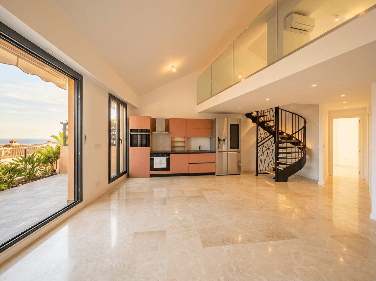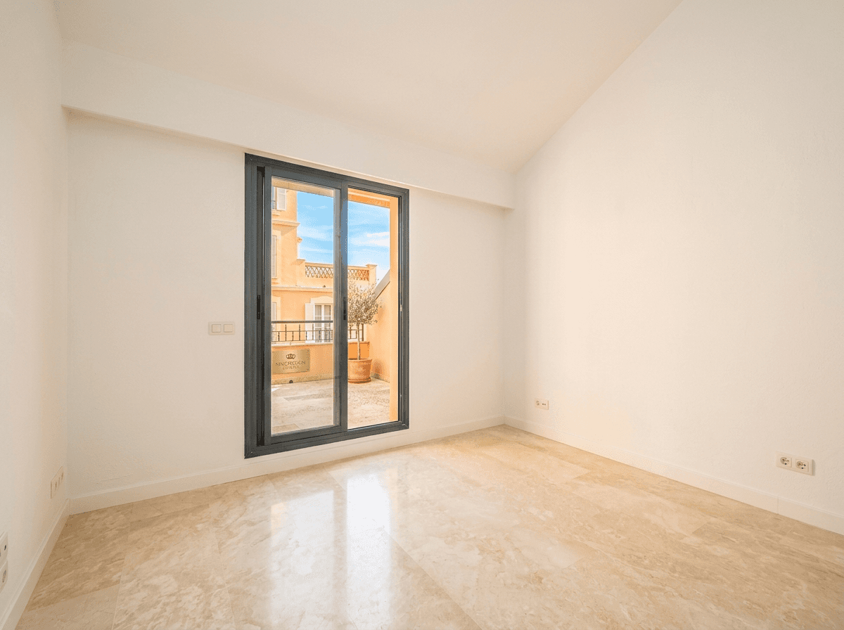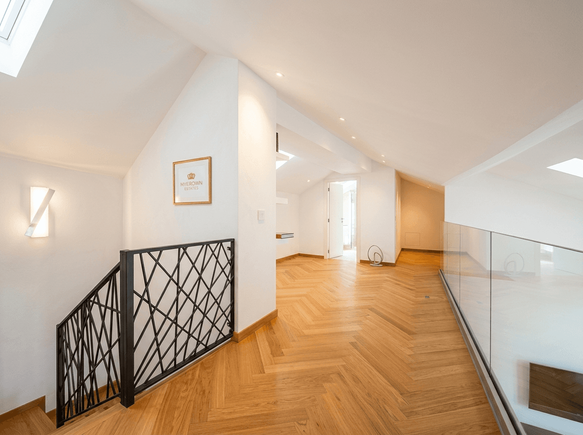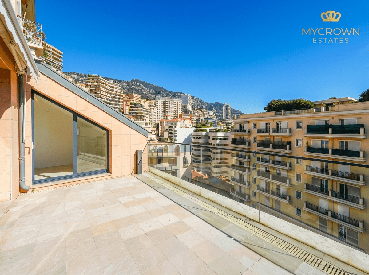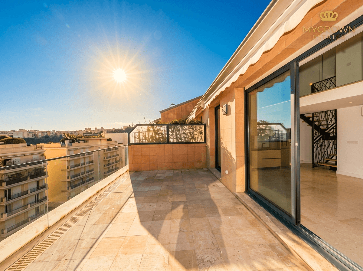 À l’étage supérieur, une élégante mezzanine abrite la suite parentale. Elle comprend un coin nuit intime, une salle d’eau attenante et un espace dressing aménagé. De sa position surélevée, la propriété offre une vue imprenable sur la ville, le célèbre Rocher de Monaco et un bel aperçu de la mer Méditerranée.