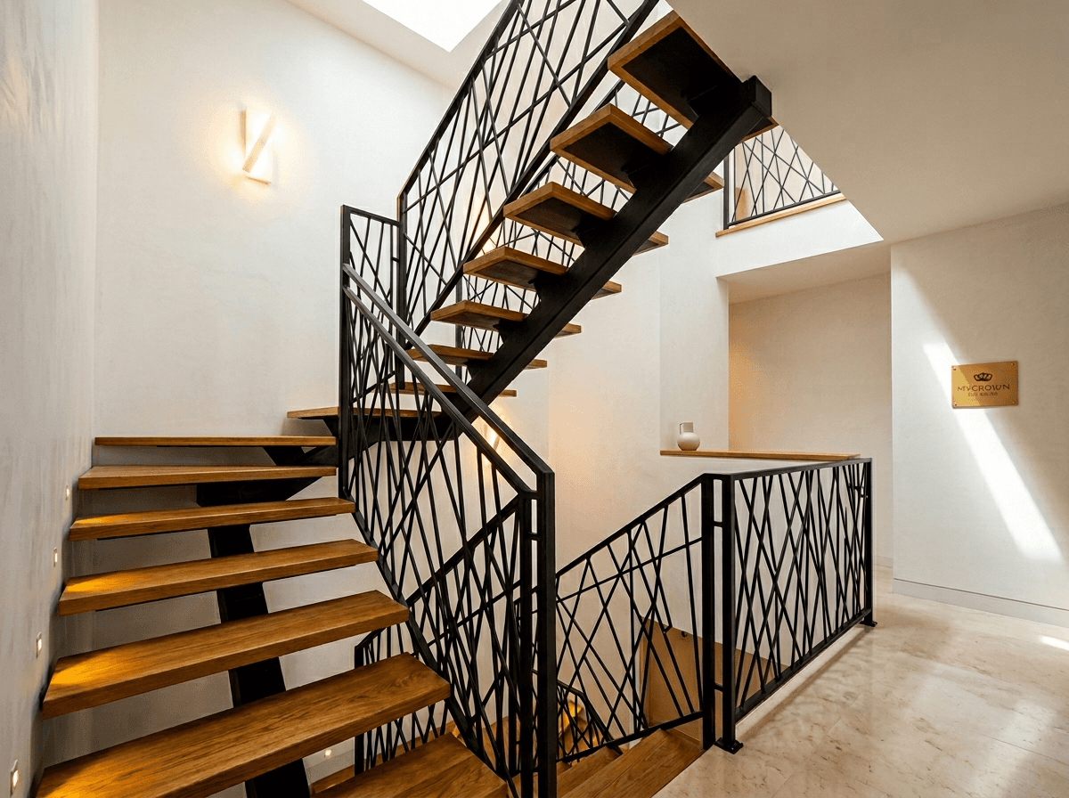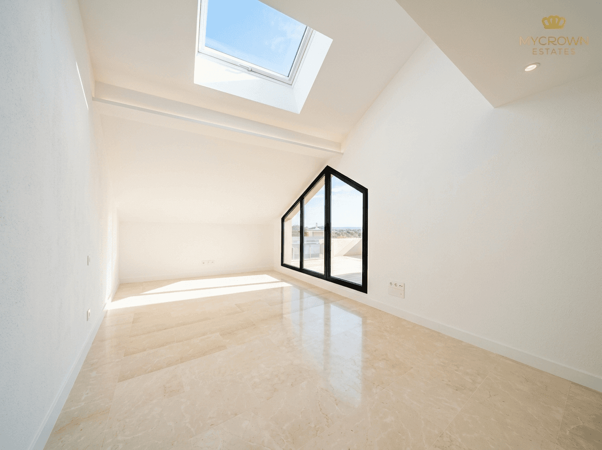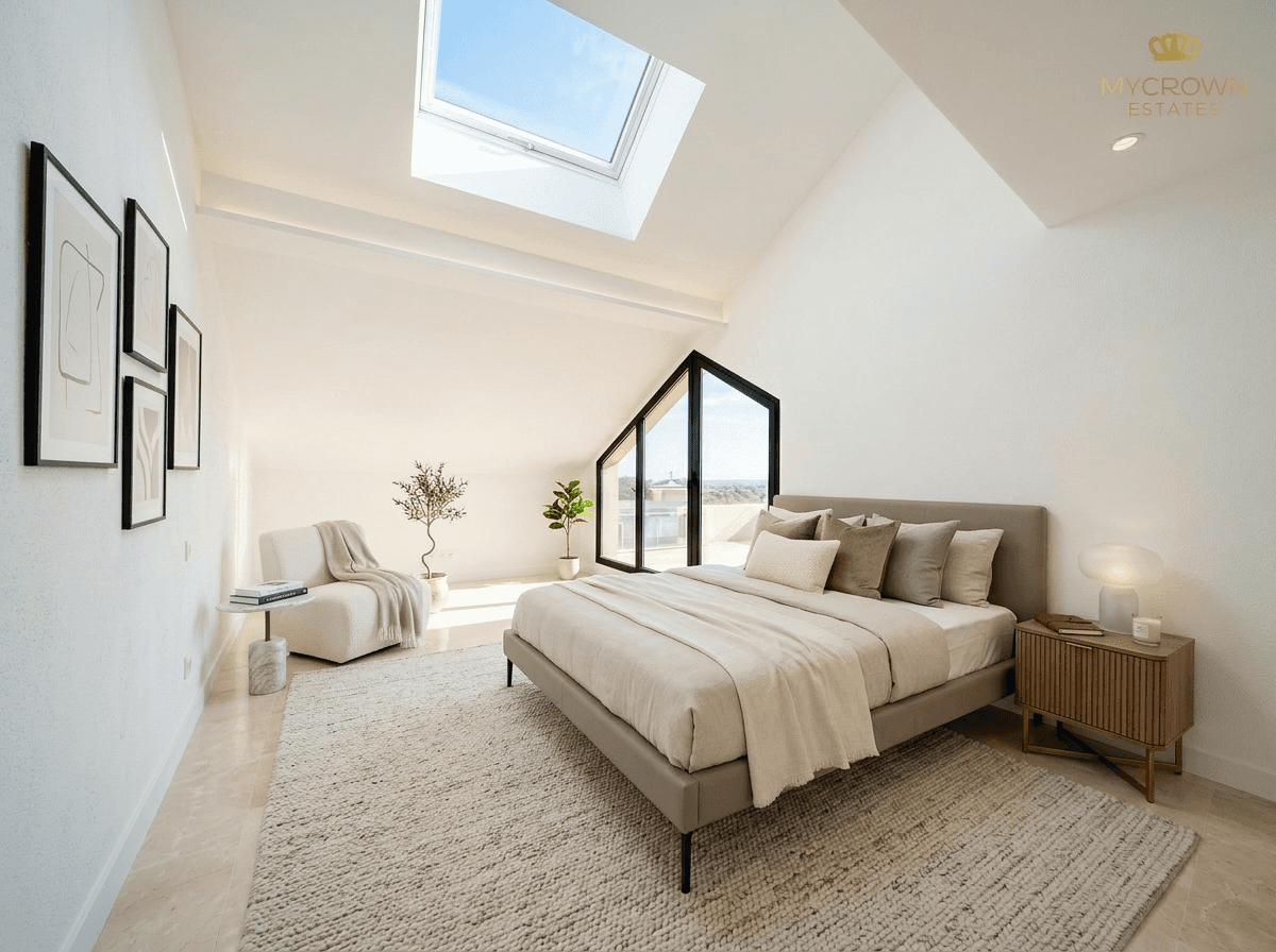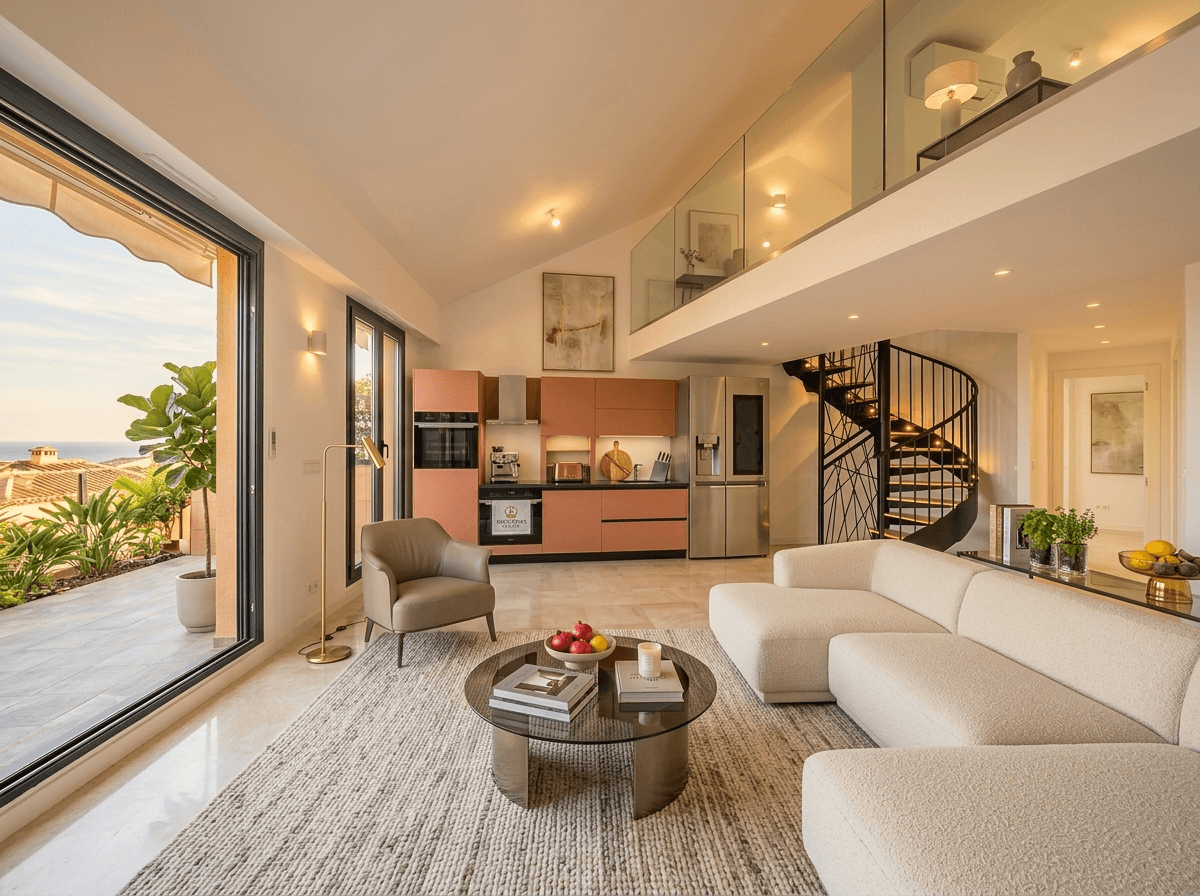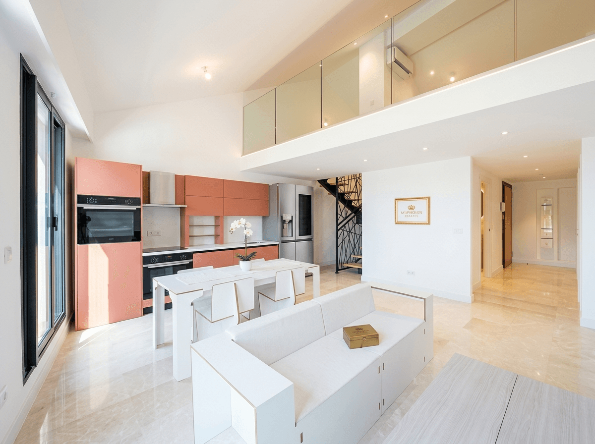 À l’étage supérieur, une élégante mezzanine abrite la suite parentale. Elle comprend un coin nuit intime, une salle d’eau attenante et un espace dressing aménagé. De sa position surélevée, la propriété offre une vue imprenable sur la ville, le célèbre Rocher de Monaco et un bel aperçu de la mer Méditerranée.