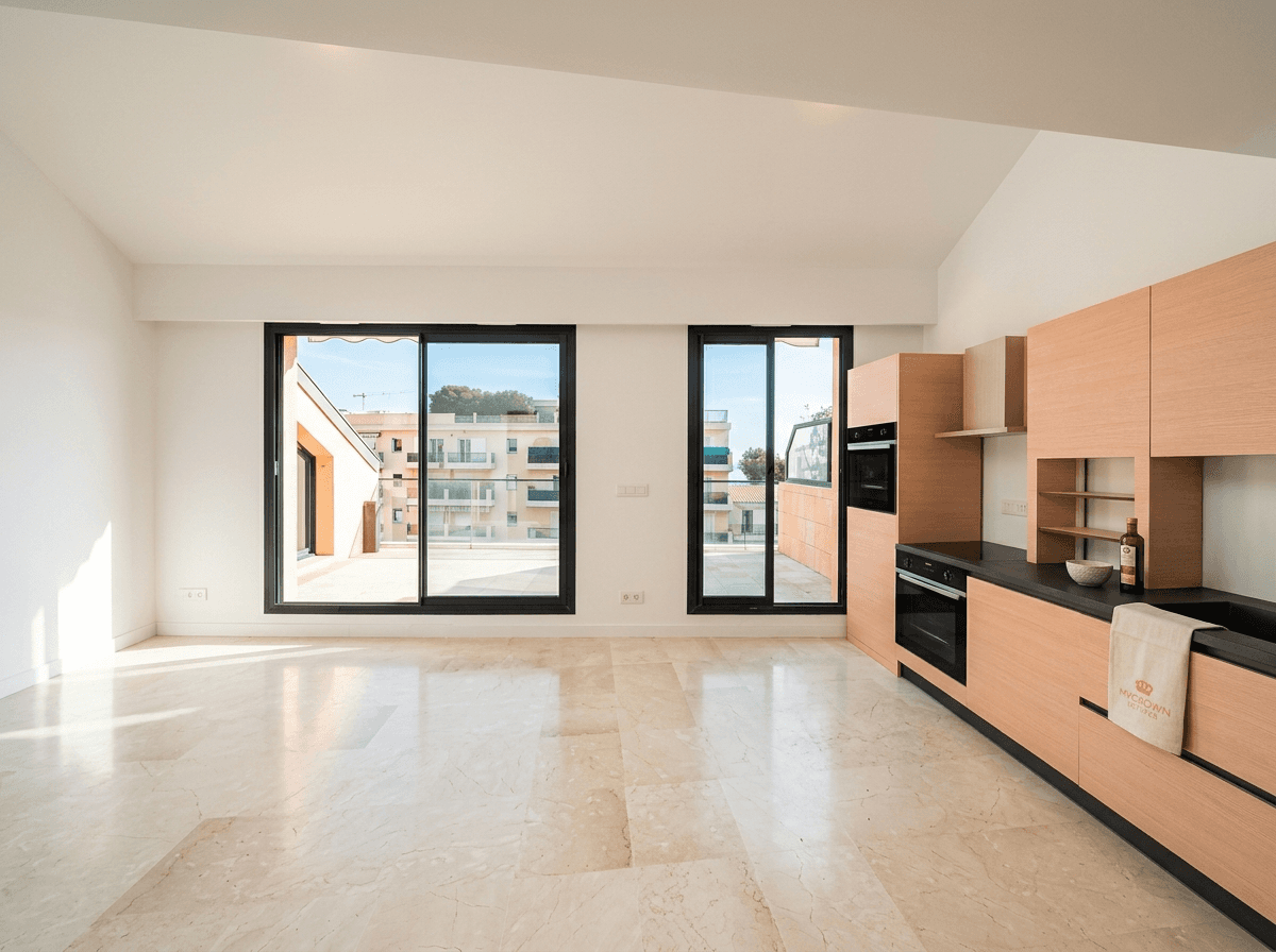 Le bien est baigné de lumière naturelle et bénéficie d'une double exposition (Sud) assurant un ensoleillement optimal tout au long de la journée. Le premier niveau s'ouvre sur une entrée accueillante menant à un salon spacieux doté d'une cuisine américaine (laissée à aménager selon vos préférences, offrant une belle toile blanche). Ce niveau propose également deux agréables chambres avec un accès direct à la terrasse extérieure, ainsi qu'une salle de bain et une salle d’eau avec WC.