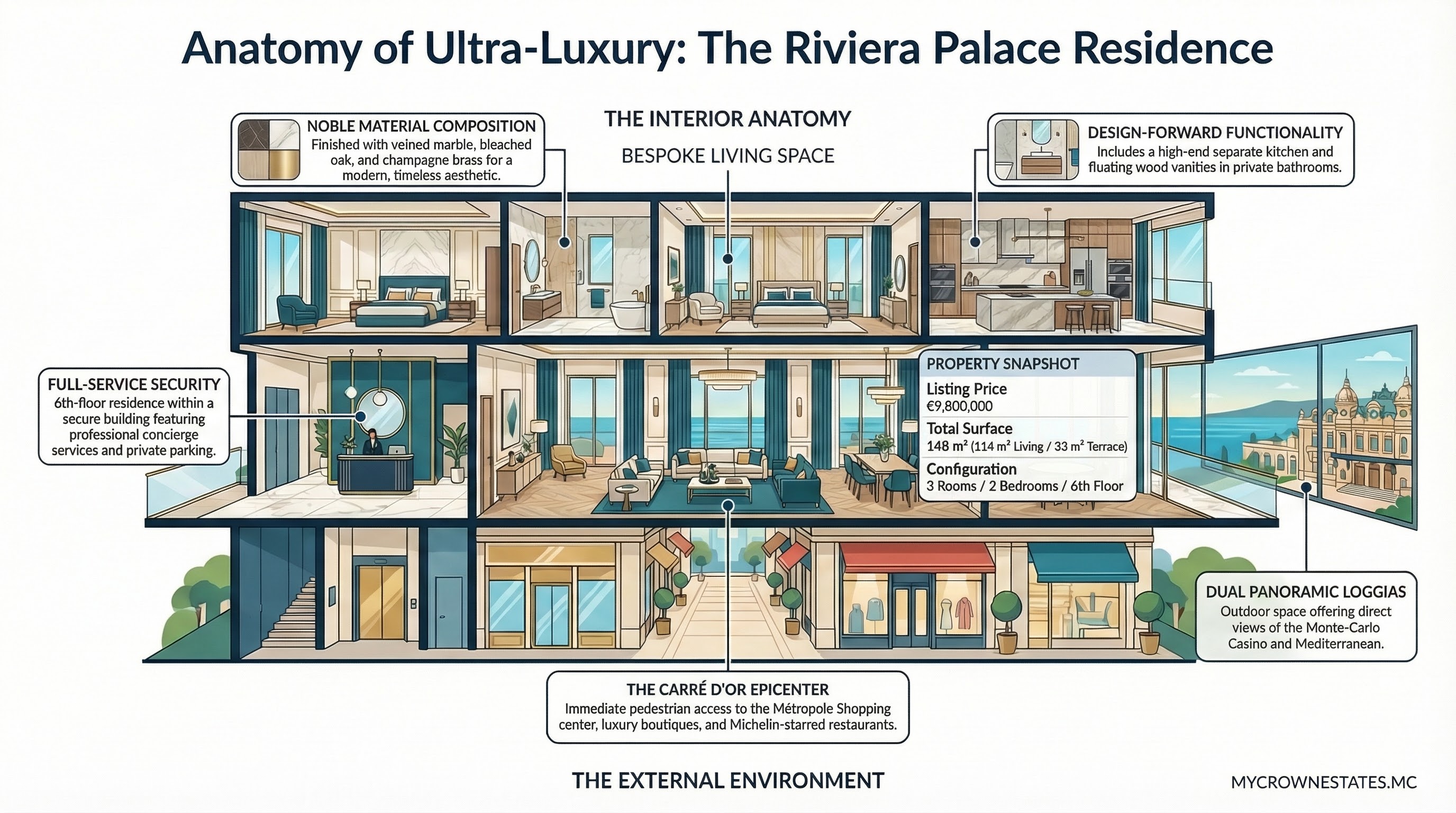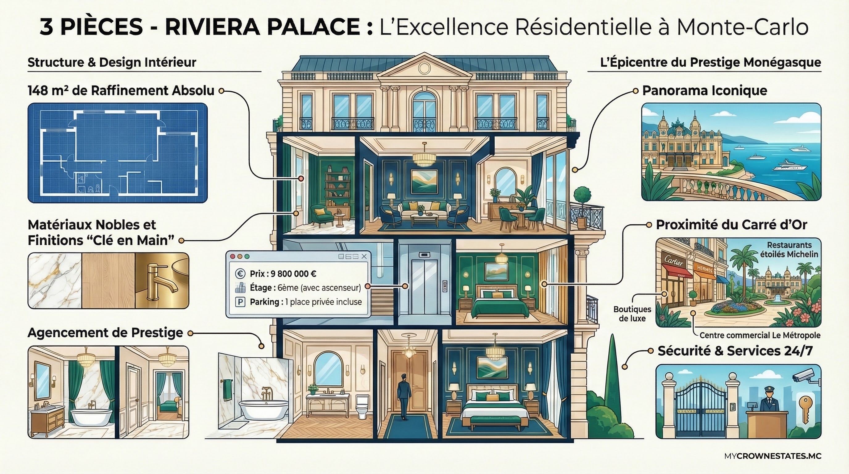 Habiter le Riviera Palace, c’est s’installer au cœur de l'élégance absolue de Monte-Carlo, à quelques pas seulement du prestigieux Carré d'Or. Dans cet immeuble sécurisé avec conciergerie, vous dominez la ville tout en étant à l'épicentre des meilleures boutiques, restaurants et sites culturels de la Principauté.