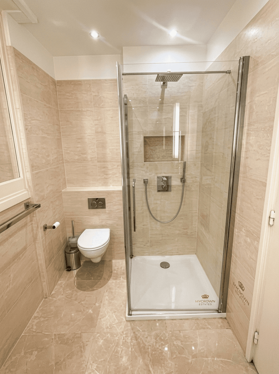 L'espace nuit, bien délimité, se compose d'une belle chambre parentale donnant sur l’avant du bâtiment, avec un accès direct à la terrasse, et d'une deuxième chambre confortable. Une salle d’eau moderne et des toilettes invités complètent parfaitement l'agencement de cet appartement aux prestations soignées.