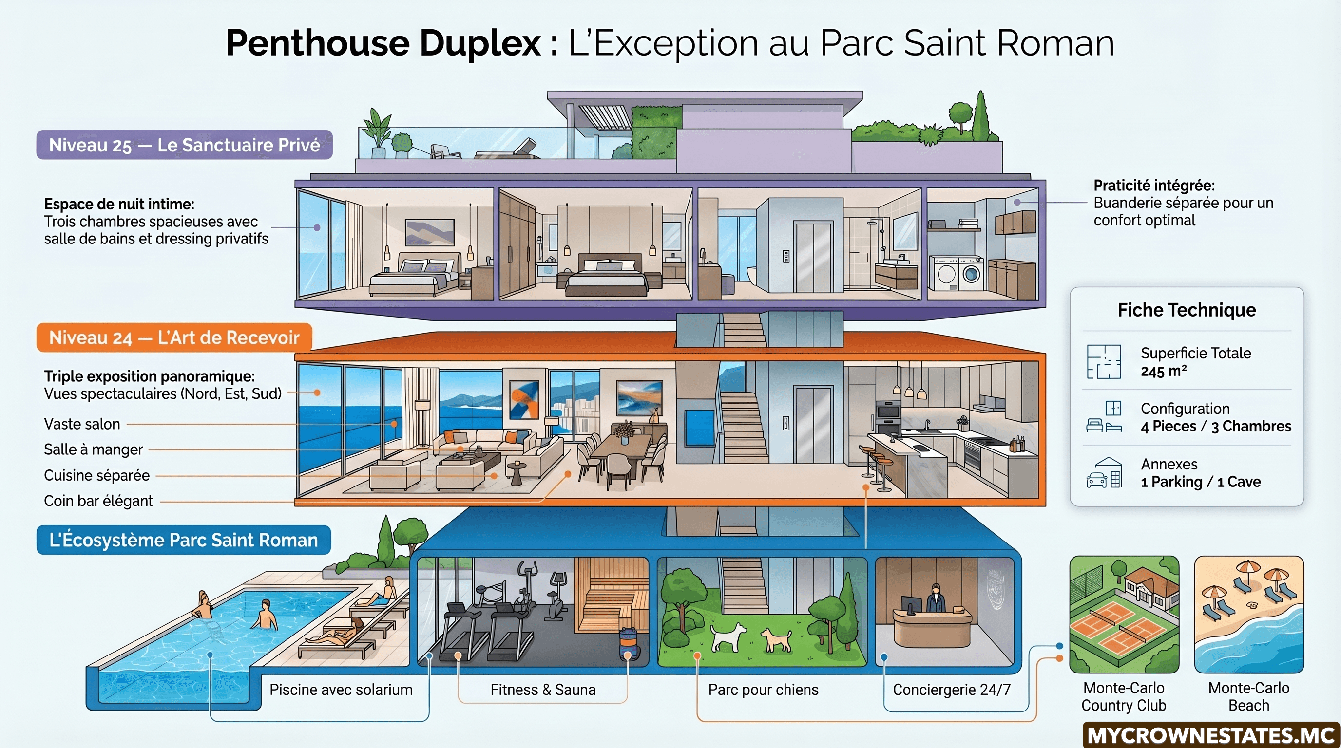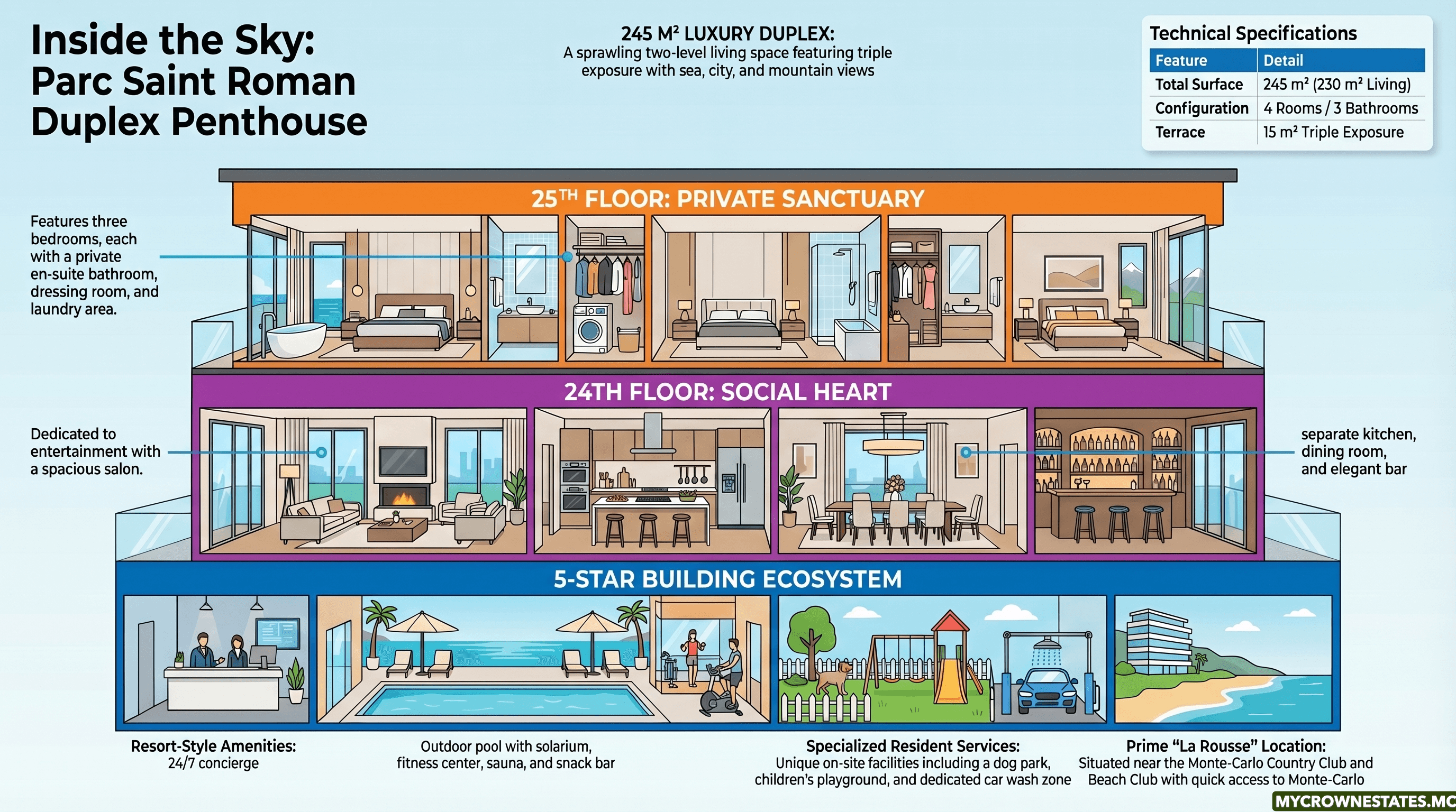 C'est un quartier résidentiel chic surplombant Monaco qui offre un calme absolu, des jardins verdoyants, un accès rapide à Monte-Carlo via le Boulevard d'Italie, et la proximité des commerces de la Place des Moulins situés à environ 1km. La Rousse-Saint Roman offre l'équilibre parfait : des vues mer exceptionnelles, la proximité des plages et des restaurants, et des immeubles de standing avec une ambiance familiale internationale. Le Parc Saint Roman sublime cet esprit par sa proximité immédiate avec le prestigieux Monte-Carlo Country Club et le Monte-Carlo Beach Club.