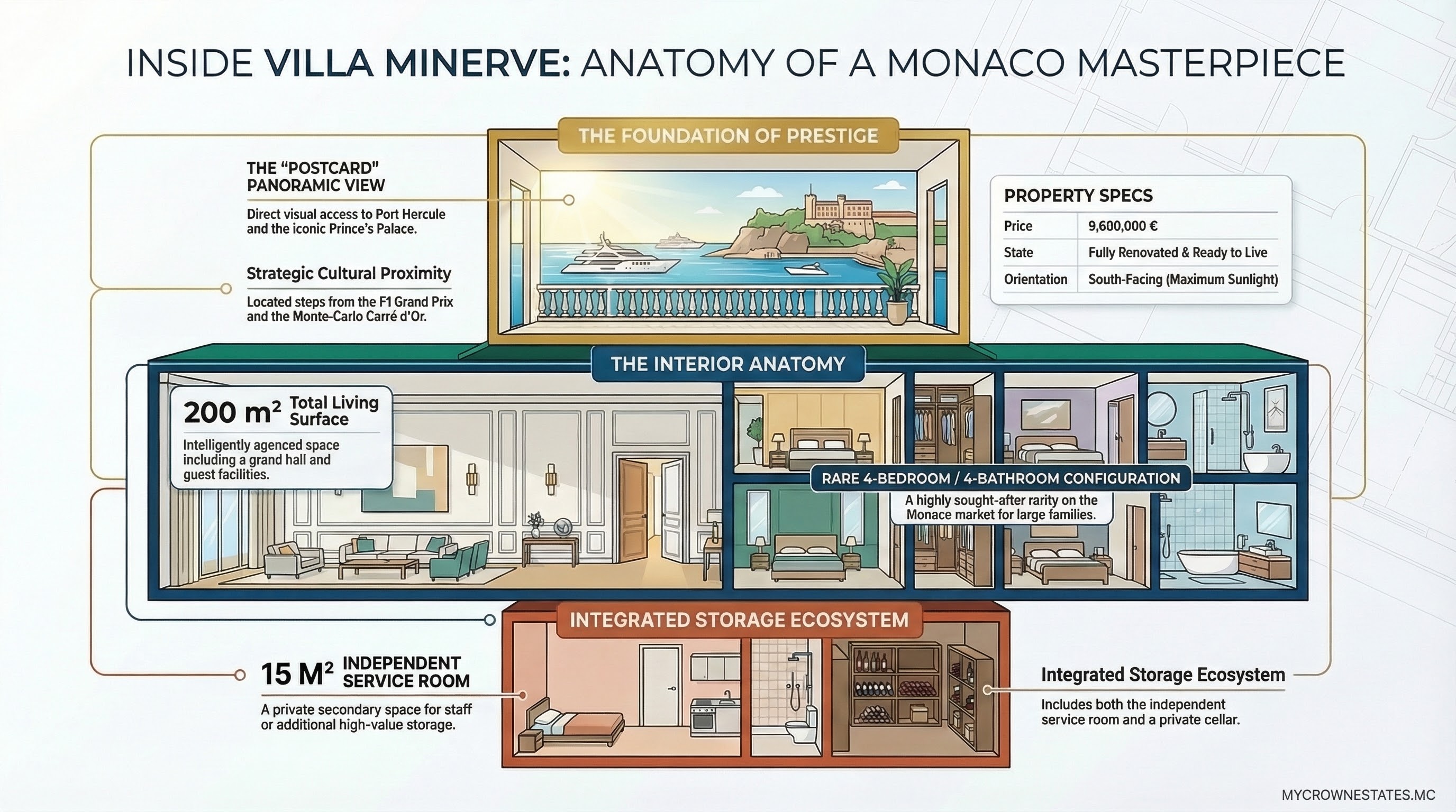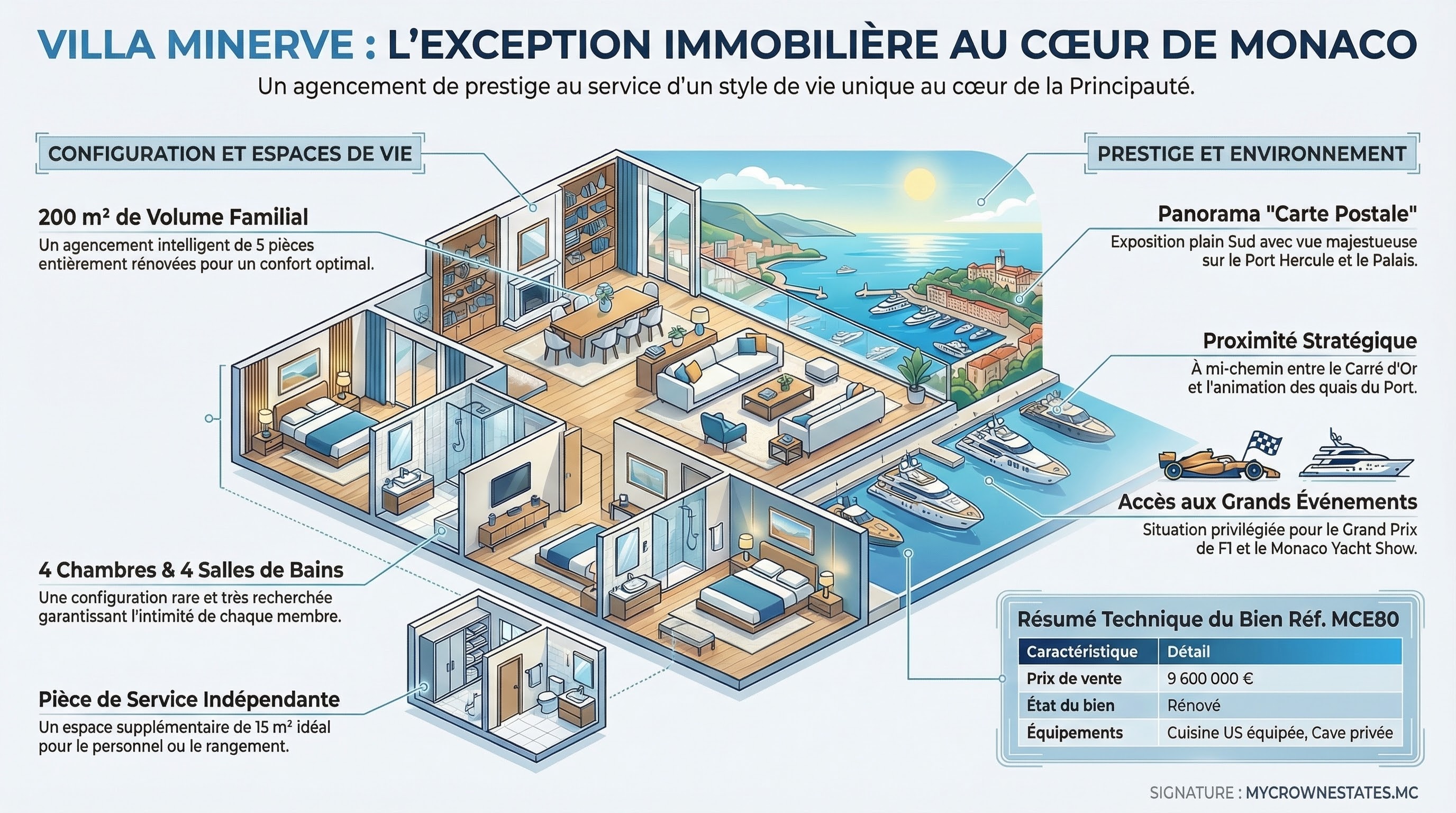 Résider à la Villa Minerve, c’est concilier l'élégance de Monte-Carlo avec la magie visuelle du Port Hercule. Vous bénéficiez d'une adresse de prestige dans un quartier résidentiel de standing, tout en ayant un accès direct aux événements mondiaux (Grand Prix de Formule 1, Monaco Yacht Show) qui s'articulent autour du port.