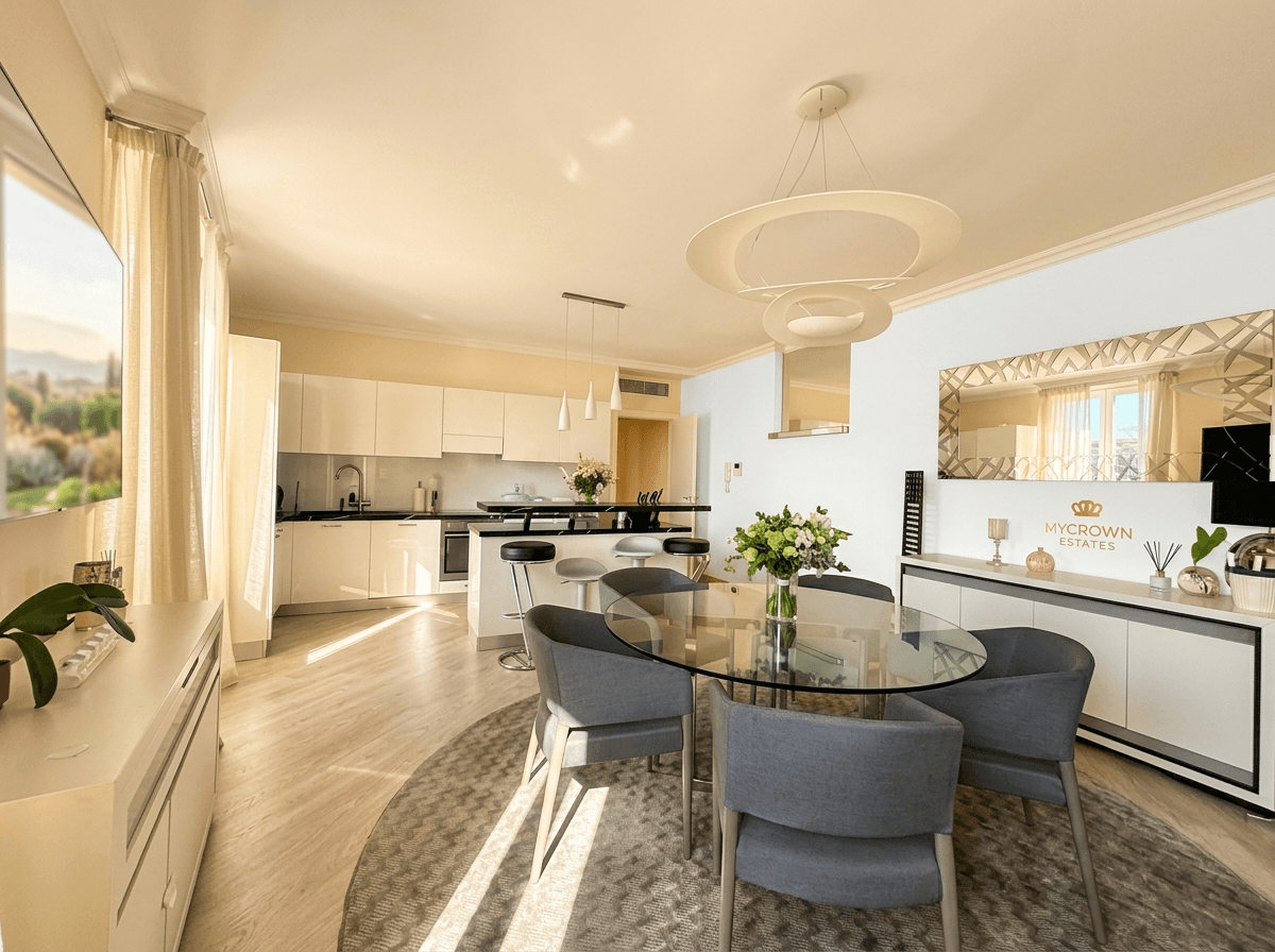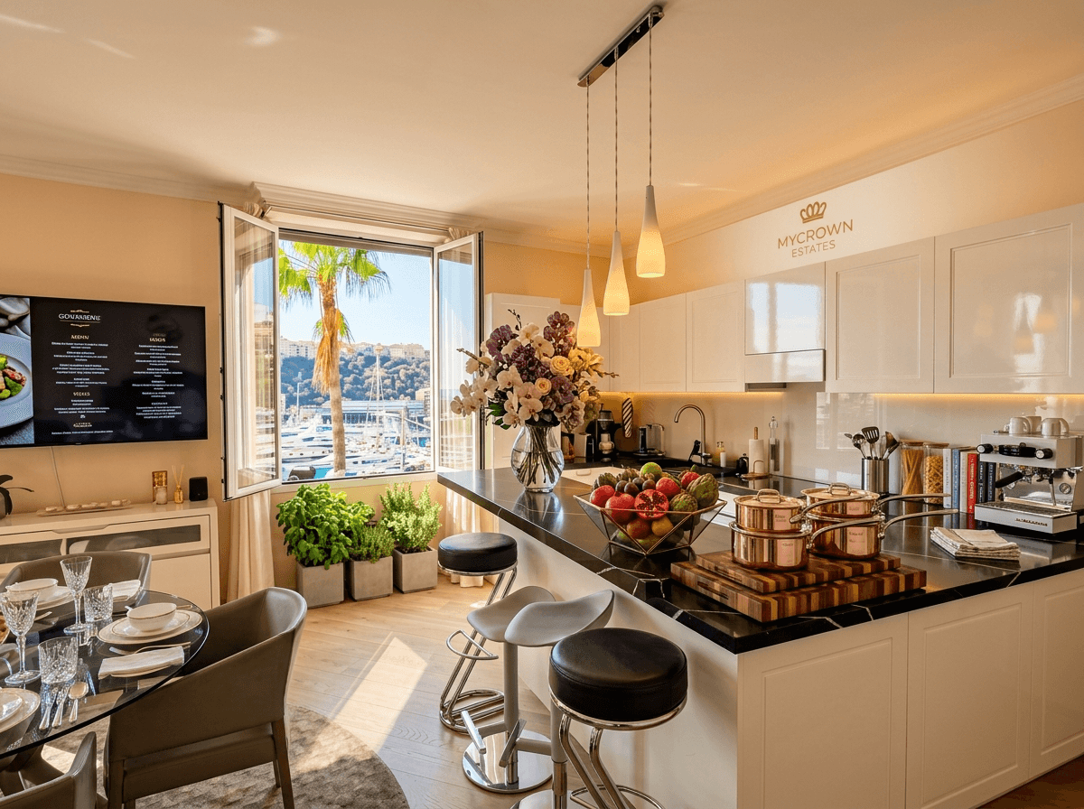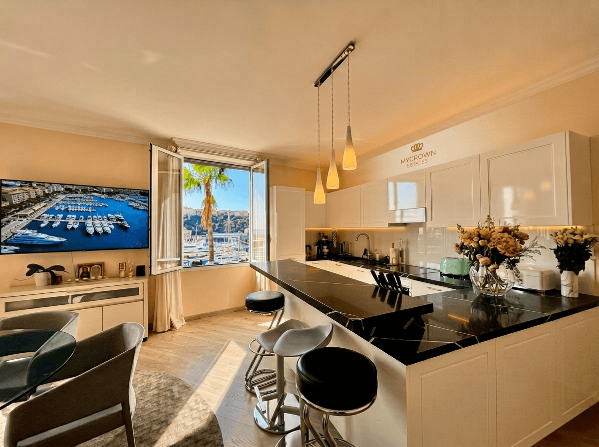 Au bout du couloir se dévoile le cœur de l'appartement : un magnifique espace de vie baigné de lumière grâce à son exposition Sud. Celui-ci intègre un salon lumineux, un coin repas convivial et une belle cuisine américaine entièrement équipée avec des prestations haut de gamme. L'ensemble de la pièce de vie est orienté pour profiter du panorama époustouflant sur le port et le Rocher.