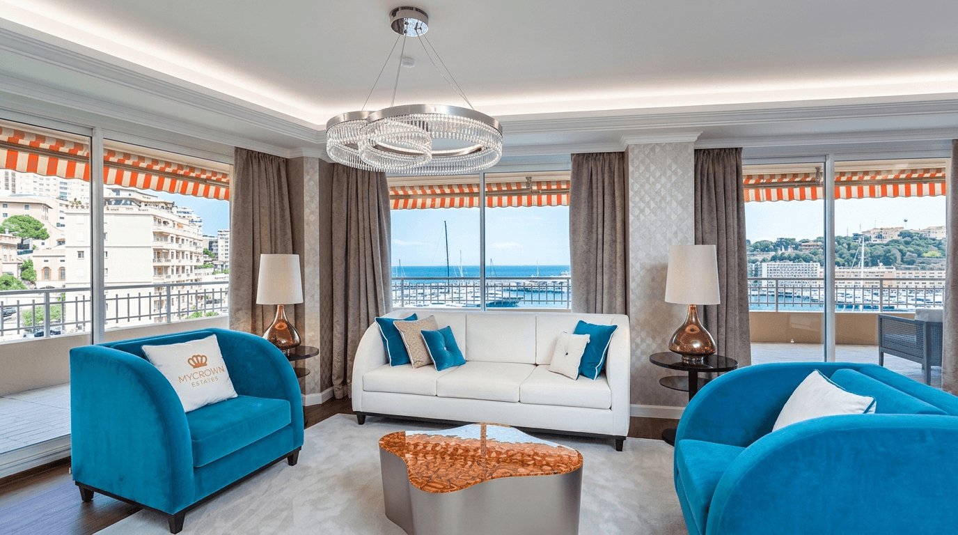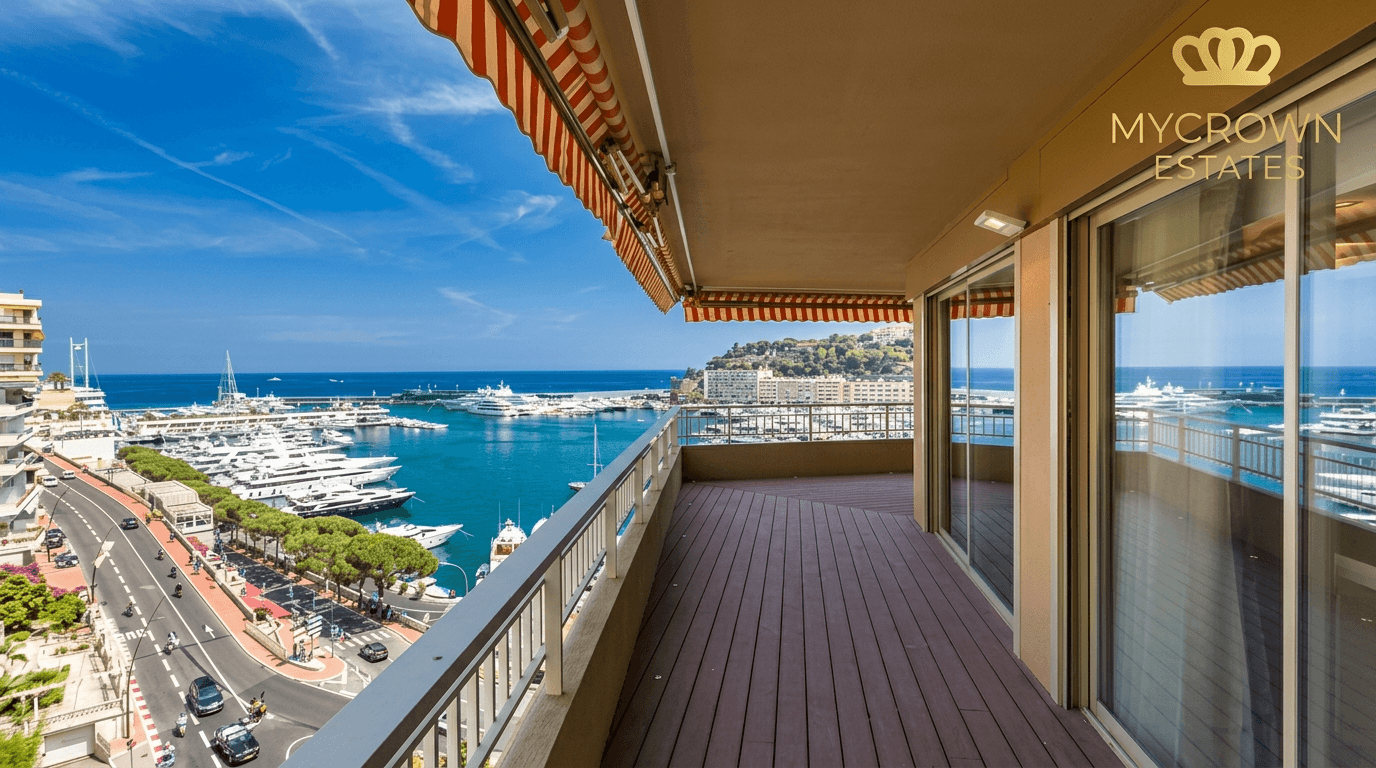 Un Panorama iconique : Vue sur le Port Hercule, les yachts, la mer et le tracé du Grand Prix de Monaco, depuis l’une des résidences les plus recherchées du front de mer.