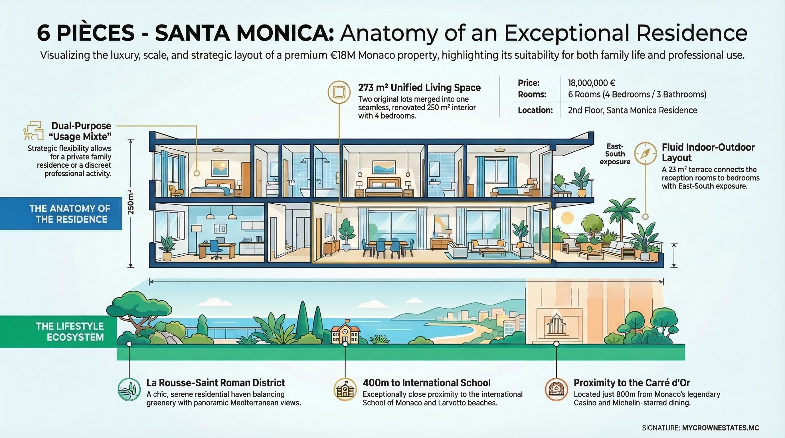 Situé au 2ème étage de la résidence Santa Monica, ce somptueux appartement de 6 pièces offre une surface totale généreuse de 273 m² (dont 250 m² habitables).