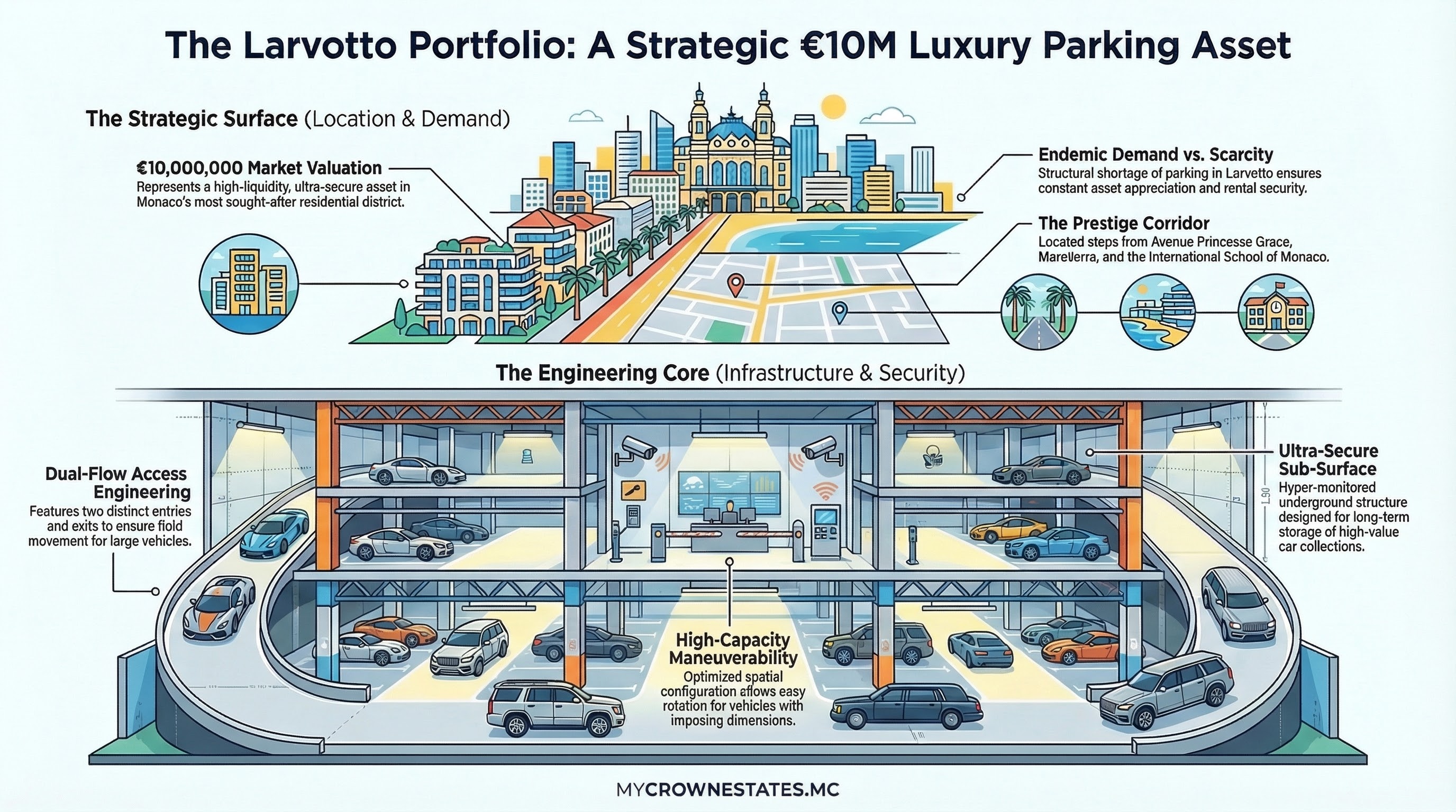 Le quartier du Larvotto est synonyme de luxe balnéaire et de dynamisme. C'est l'un des secteurs les plus recherchés de Monaco, concentrant des résidences de très grand standing, des hôtels cinq étoiles, des plages privées et de prestigieux projets immobiliers (comme Mareterra ou Bay House). Posséder des places de parking ici, c'est détenir une part du quartier le plus en vogue de la Principauté.