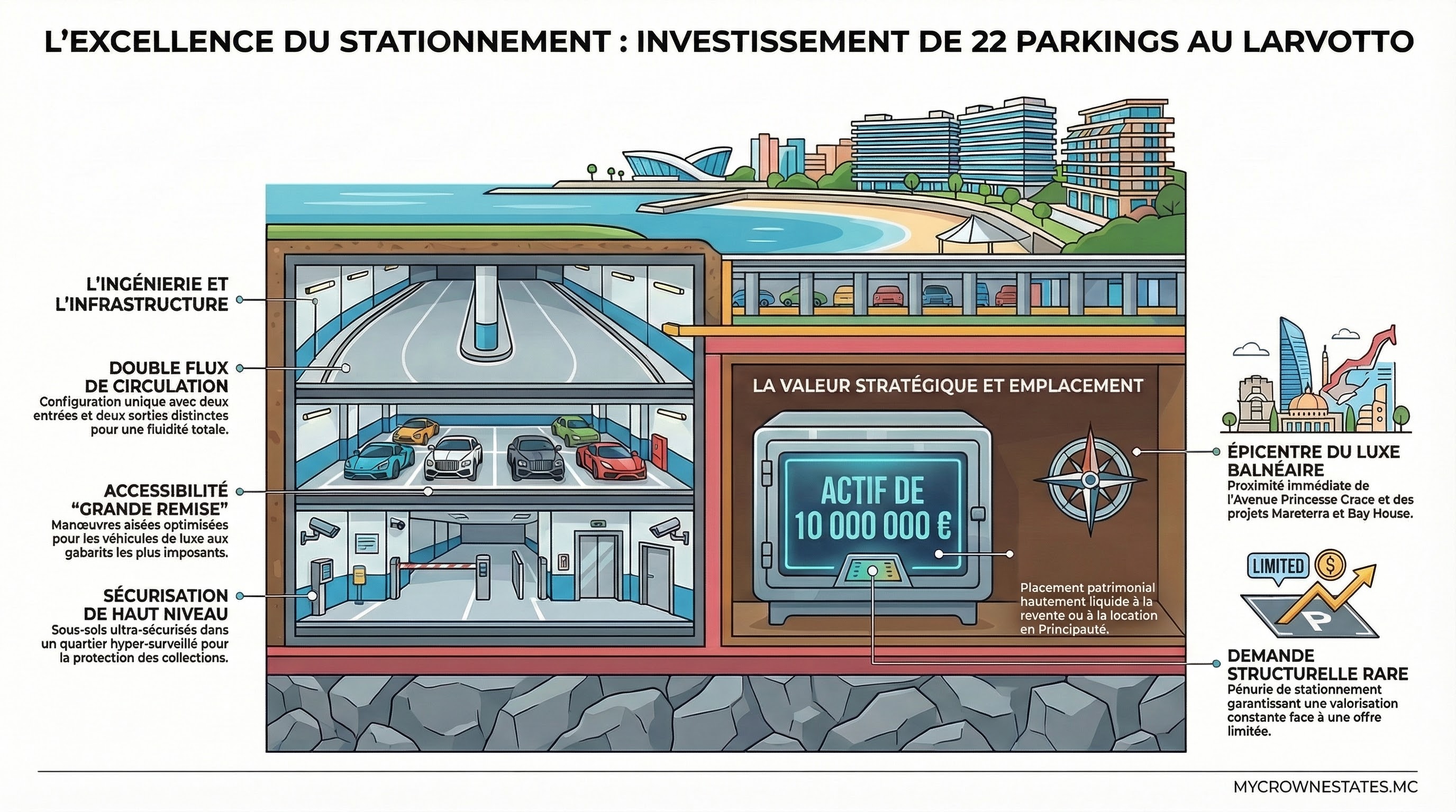 Situé dans les sous-sols ultrasécurisés d'une résidence de prestige dans le très prisé quartier du Larvotto, ce bien se compose d'un lot majestueux de 22 places de parking.