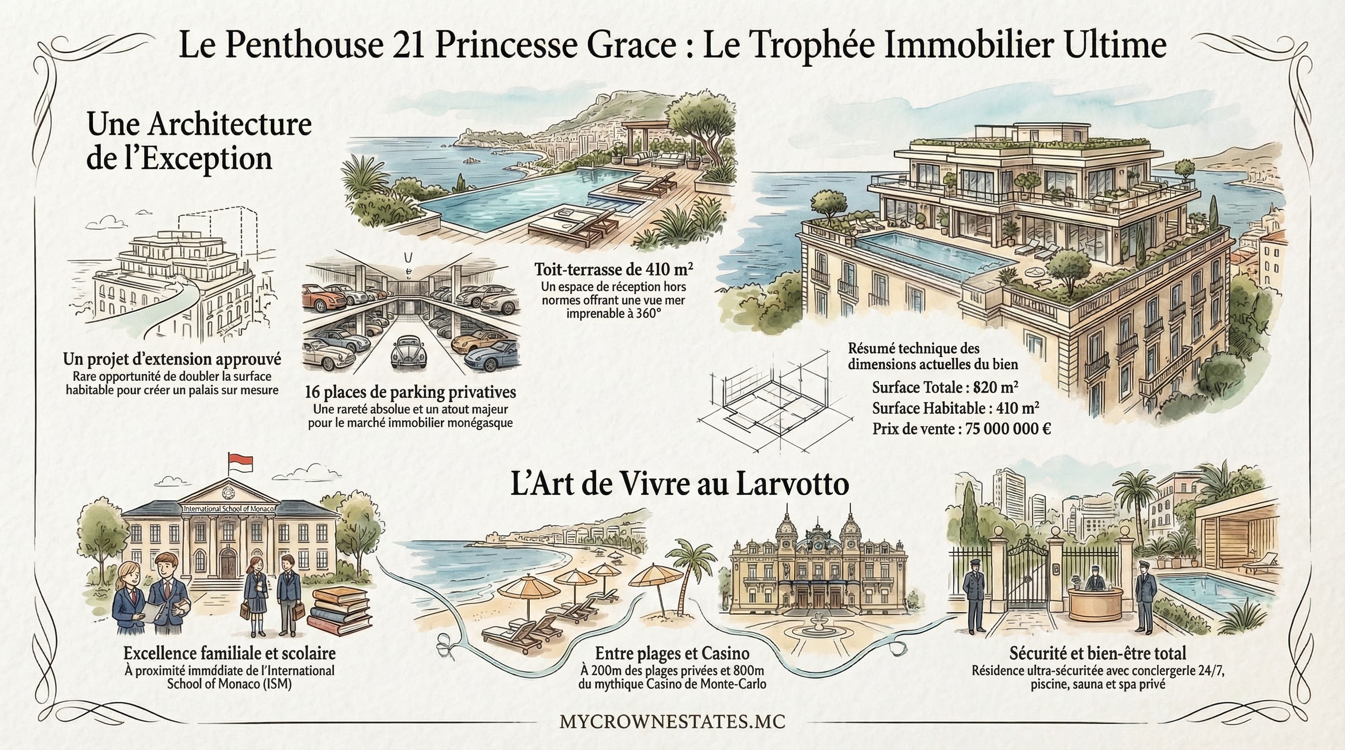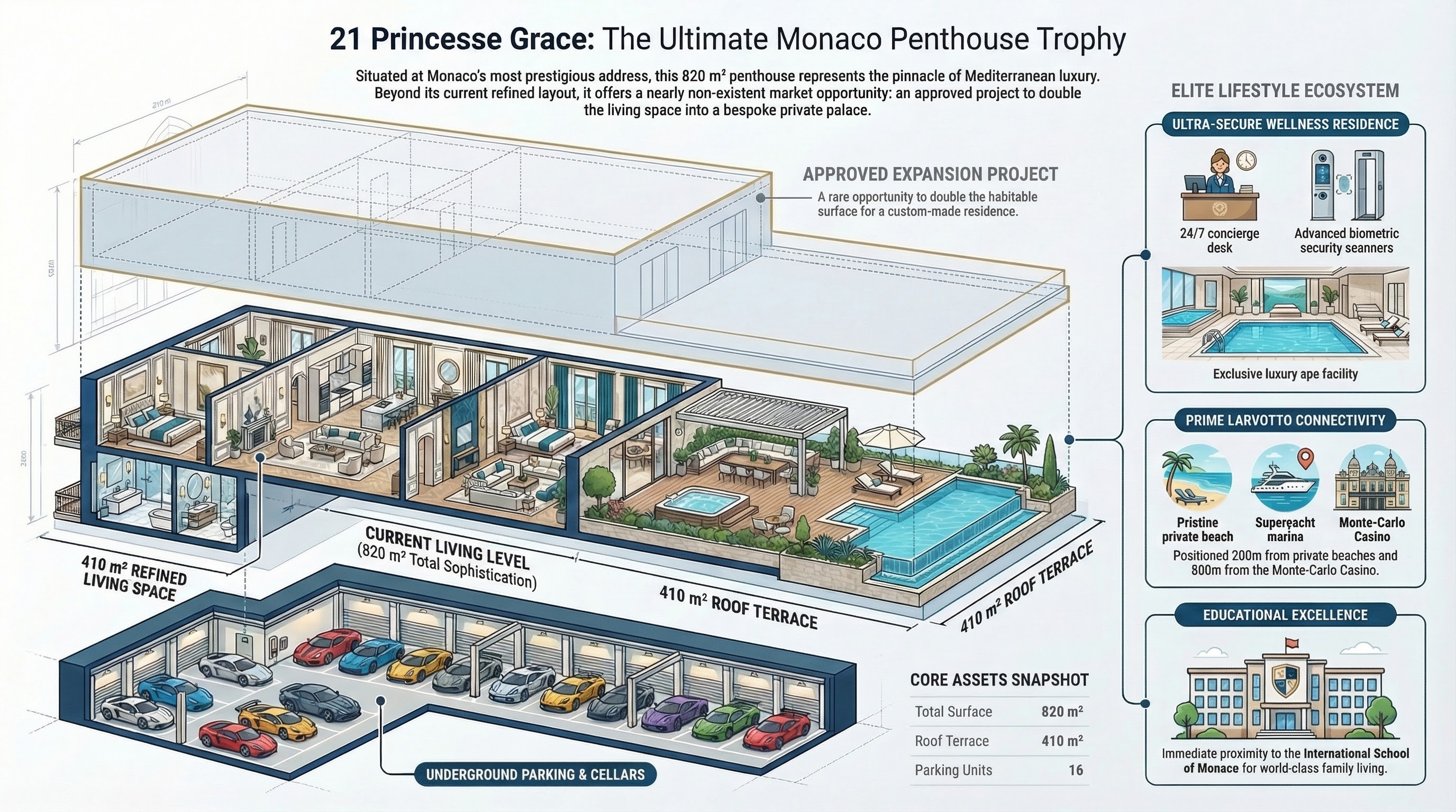D’une superficie impressionnante de 820 m² au total (dont 410 m² habitables et 410 m² de terrasses), ce penthouse d'exception propose un agencement fluide et sophistiqué.