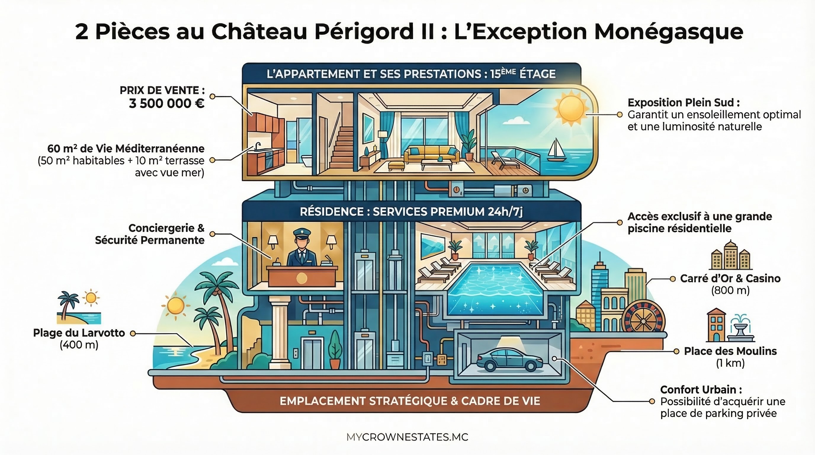 Perched on the 15th floor of the highly sought-after Château Périgord II, this elegant 2-room apartment offers a total surface area of 60 m², harmoniously divided between 50 m² of living space and a pleasant 10 m² terrace. Its south-facing aspect floods the rooms with natural light throughout the day and offers residents a striking panorama where the city of Monaco meets the blue of the Mediterranean.