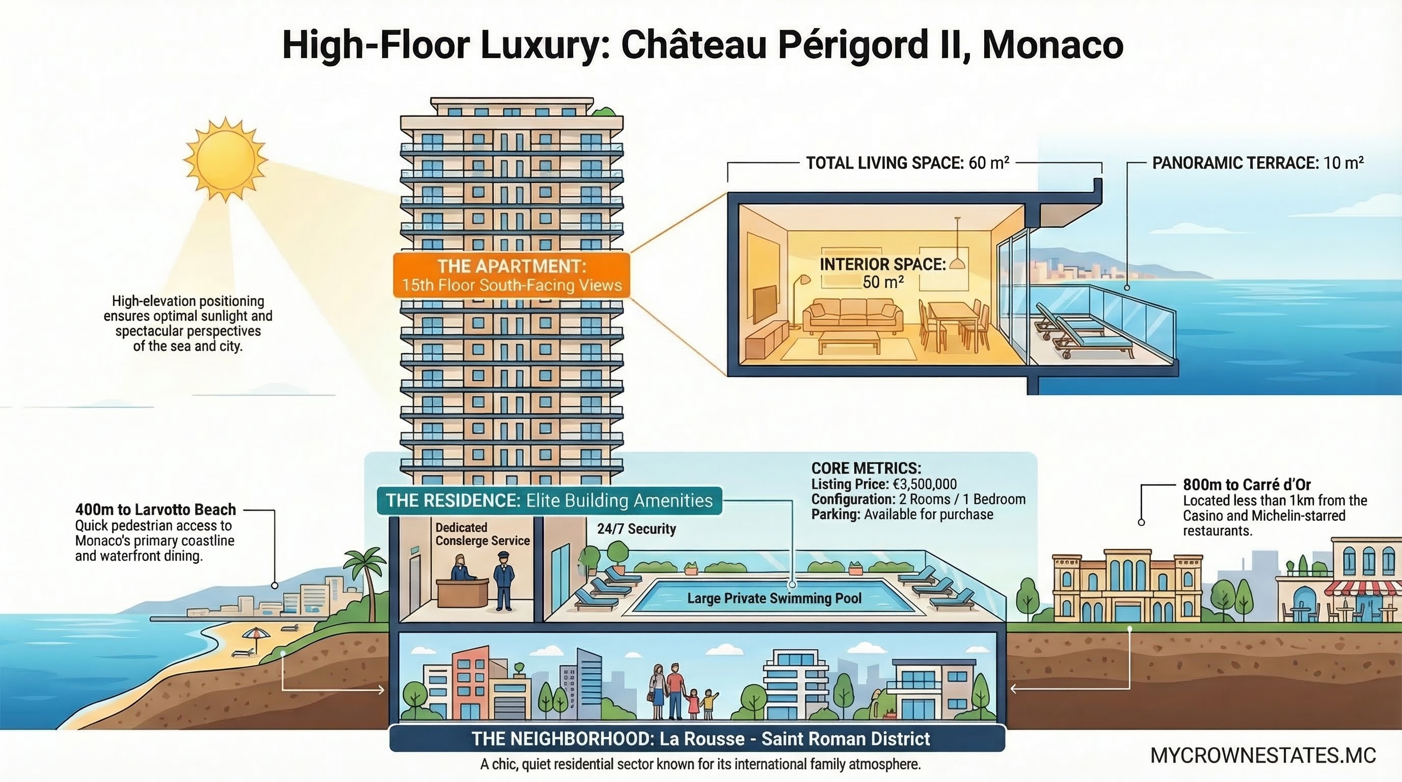 Seaside proximity: Very quick access to Larvotto Beach, located around 400m away.