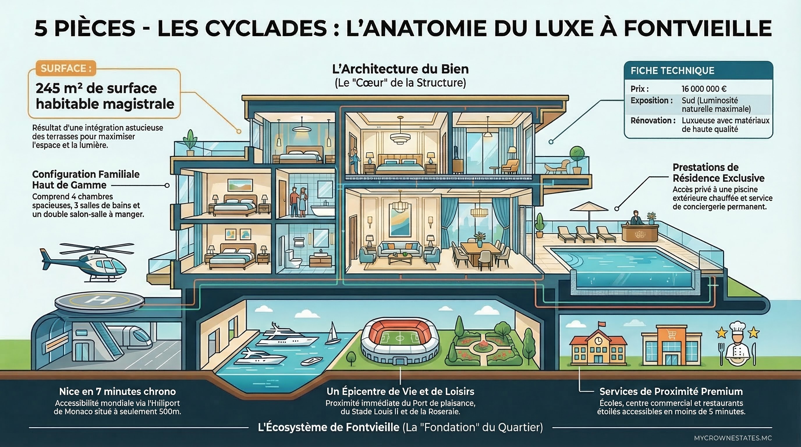 Unrivalled international connectivity thanks to the Monaco Heliport located 500m away, allowing you to reach Nice Airport in just 7 minutes.
