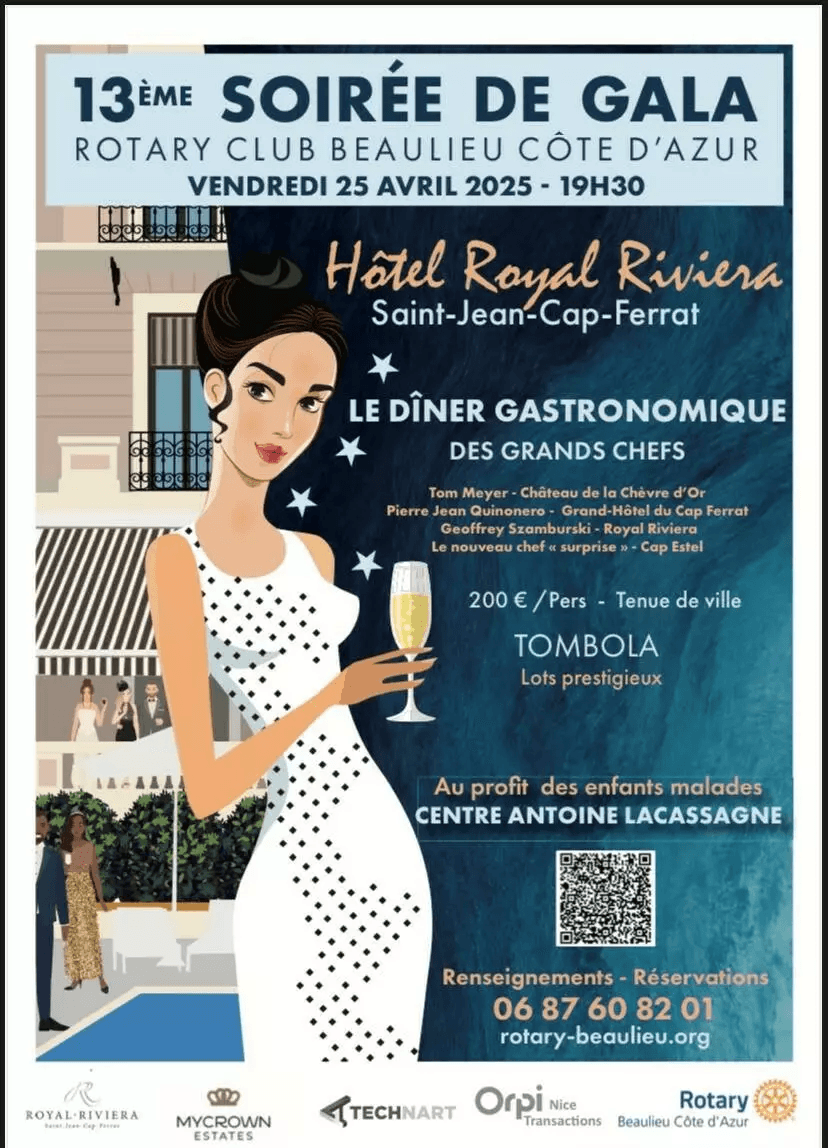 Le Rotary Club Beaulieu Côte d'Azur, membre du Rotary International, un réseau mondial de 1,4 million de voisins, d'amis et de leaders, se consacre au service humanitaire, à la promotion de la paix et à l'amélioration des conditions de vie tant au niveau local qu'à l'échelle mondiale. Nous sommes honorés de soutenir cet événement prestigieux, dont tous les profits seront reversés au Centre Antoine à Lacassagne pour venir en aide aux enfants. Ensemble, nous faisons la différence.