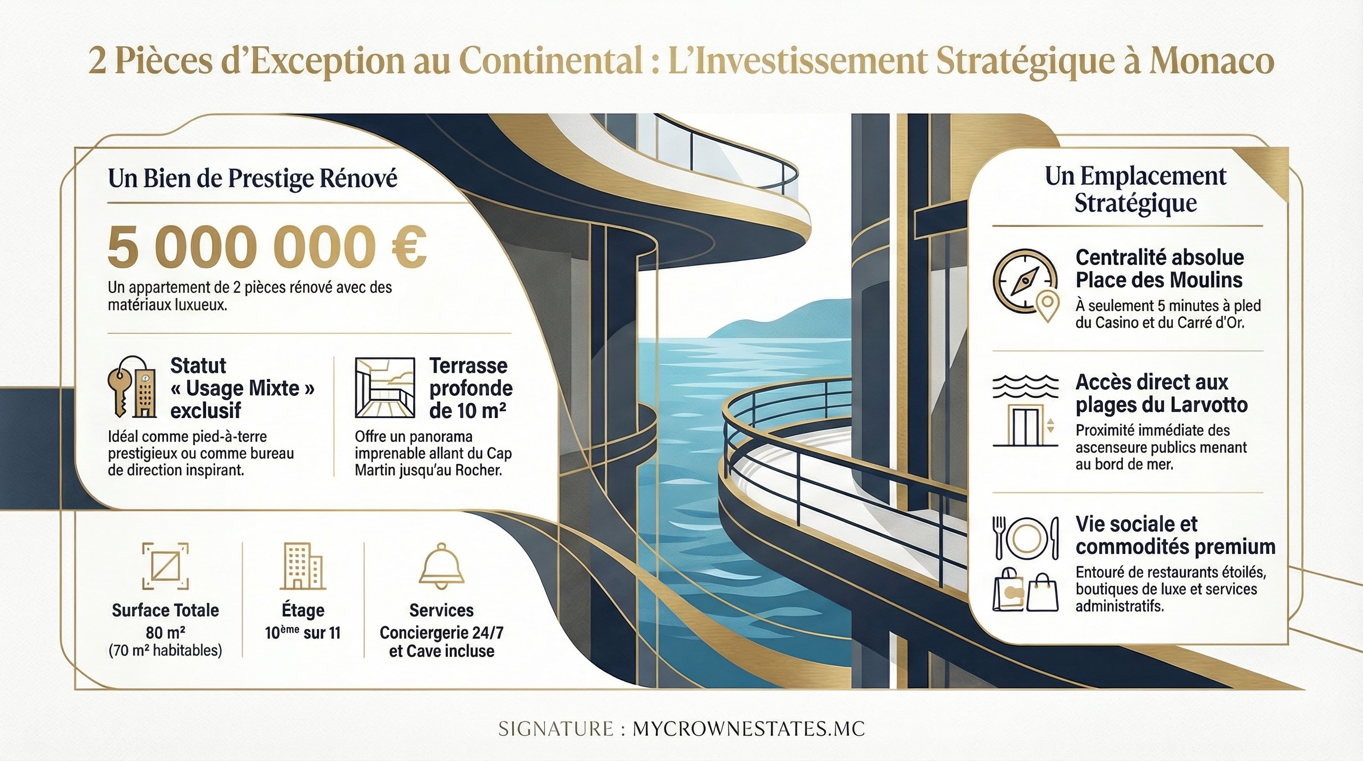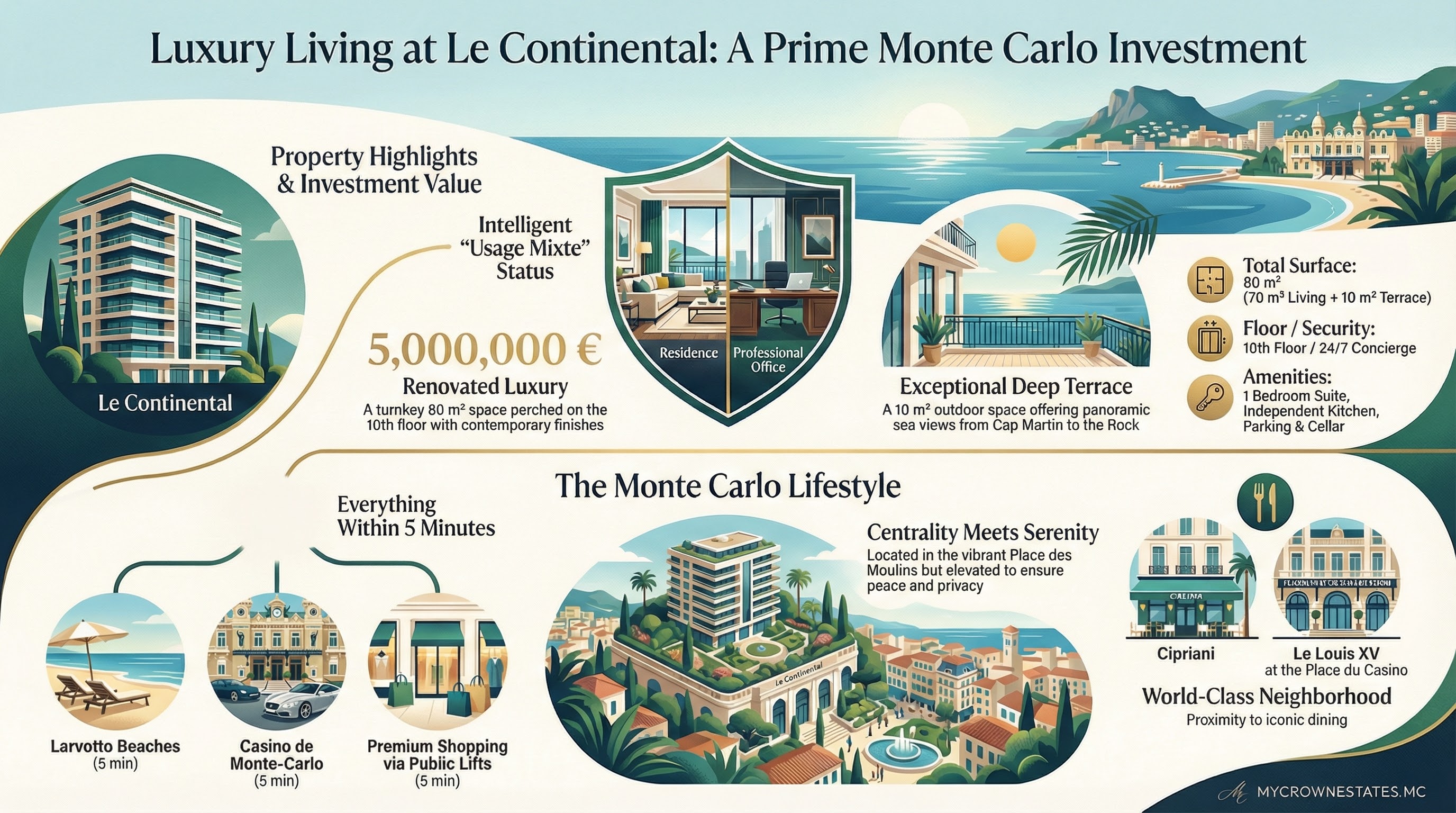 Habiter Le Continental, c’est s’installer Place des Moulins, au cœur animé de Monte‑Carlo, dans un immeuble moderne de 11 étages avec conciergerie 24/7, à quelques minutes à pied de la Place du Casino et des plages du Larvotto. Cette adresse stratégique offre une vue dégagée sur la ville et la mer, dans un quartier où se mêlent élégance cosmopolite, commerces premium et animation permanente des événements monégasques. Monte‑Carlo au Continental, c’est le parfait équilibre entre centralité absolue et confort résidentiel haut de gamme.