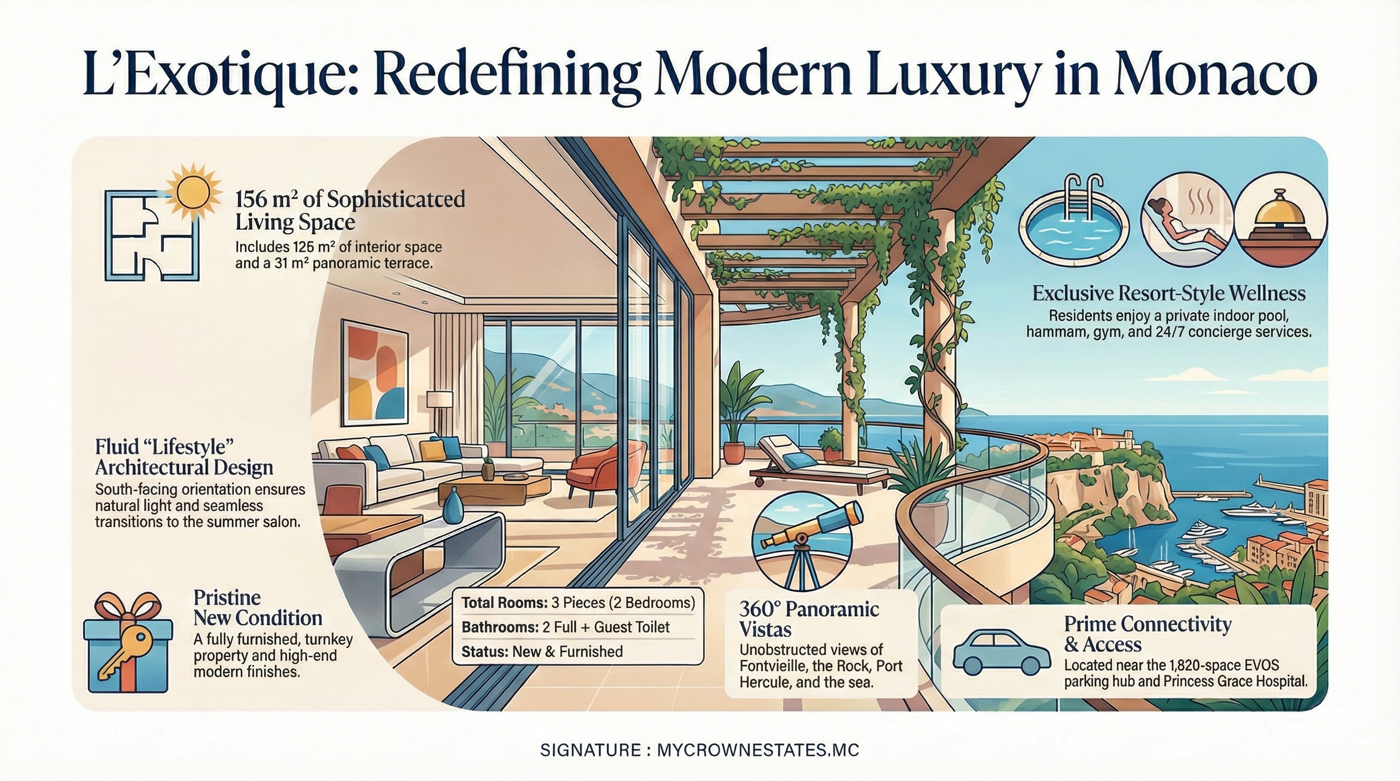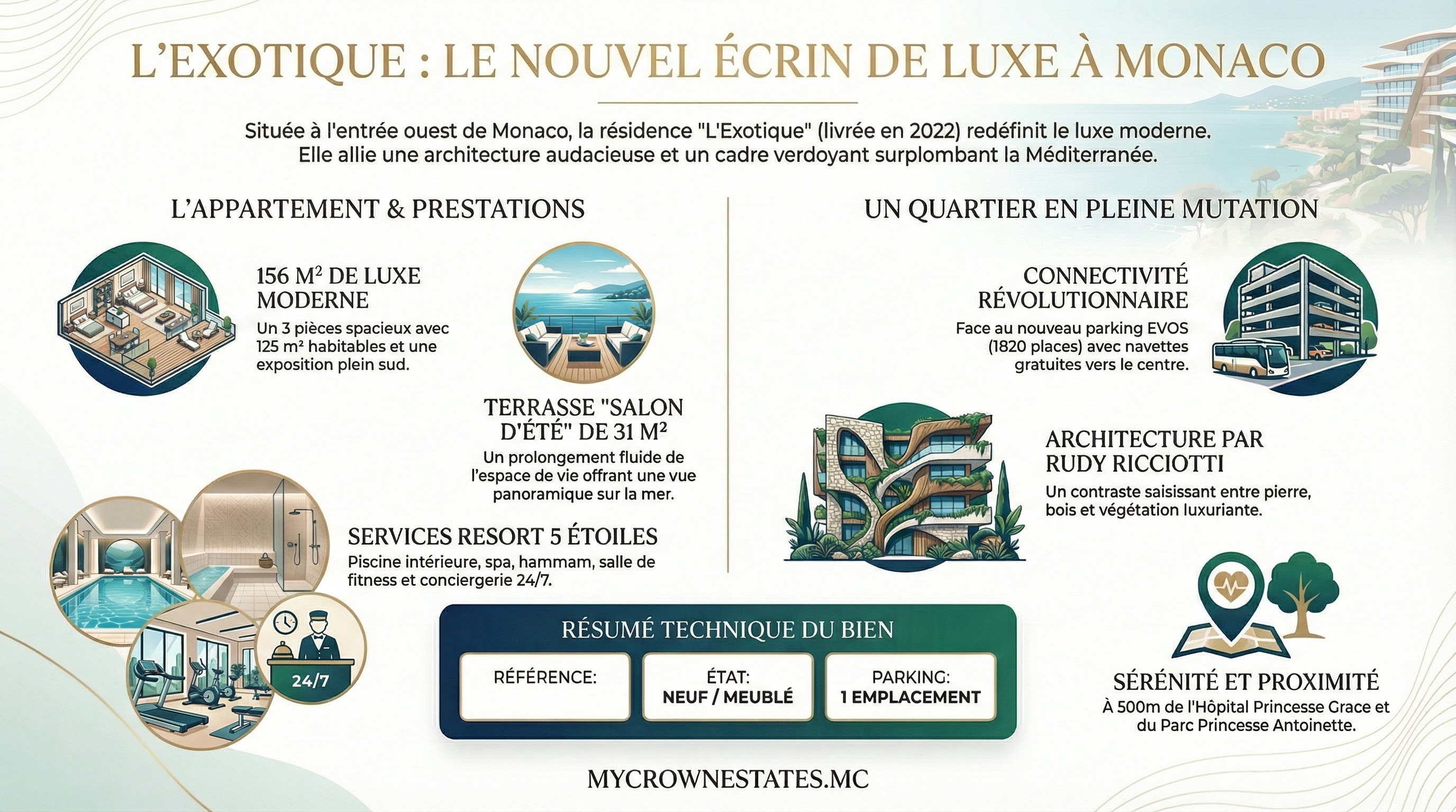 L'Exotique positionne le Jardin Exotique comme le nouveau cœur résidentiel premium : piscine spa neuf 2022, vue 360°, parking 1820 places à 0m, HPG à 500m.