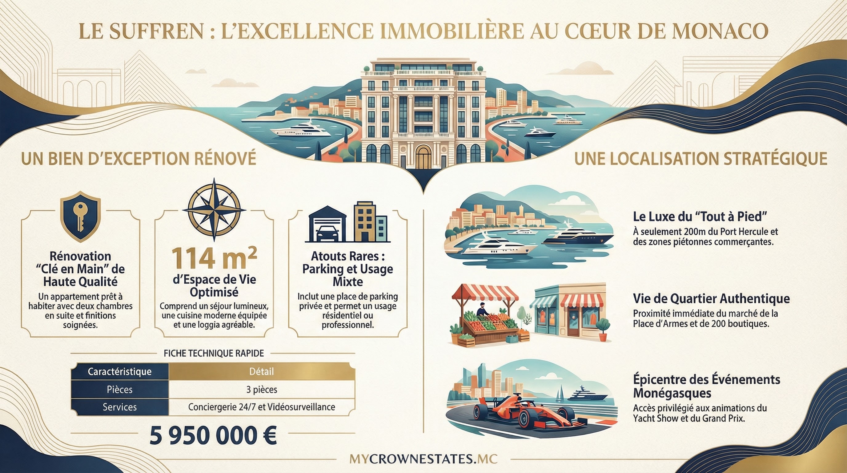 S’installer au Suffren au 7 Rue Suffren Raymond, c’est vivre dans un immeuble de standing construit en 1989 (9 étages), doté d’une conciergerie 24/7, CCTV et ascenseur, à 200m du Port Hercule et 300m de la rue Princesse Caroline. Cette résidence moderne offre des appartements lumineux, souvent rénovés avec matériaux haut de gamme, dans le quartier le plus vivant de Monaco : marché Place d'Armes, restaurants rues Grimaldi/Princesse Caroline, animations Yacht Show/Grand Prix.
