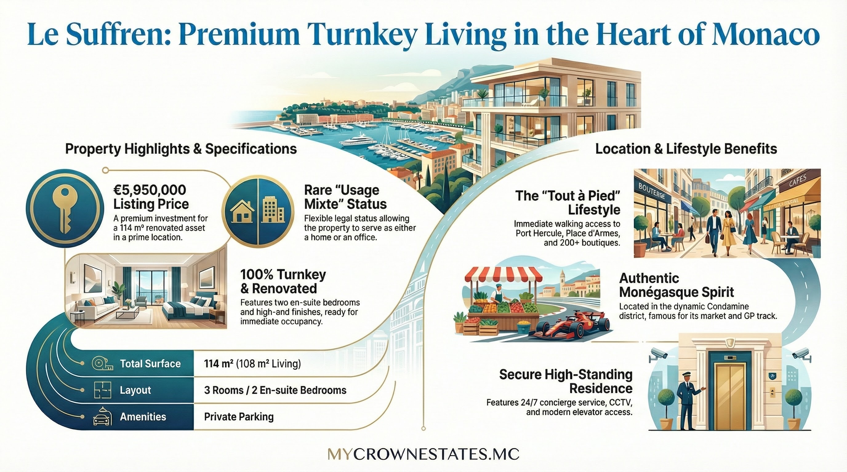 La Condamine incarne l’authenticité monégasque : rue piétonne commerçante (200 boutiques), produits frais Place d'Armes, proximité écoles internationales et gare Monaco-Monte-Carlo (1km). Rue Suffren Raymond assure calme relatif malgré l’animation, avec accès direct Port Hercule et quais événementiels.