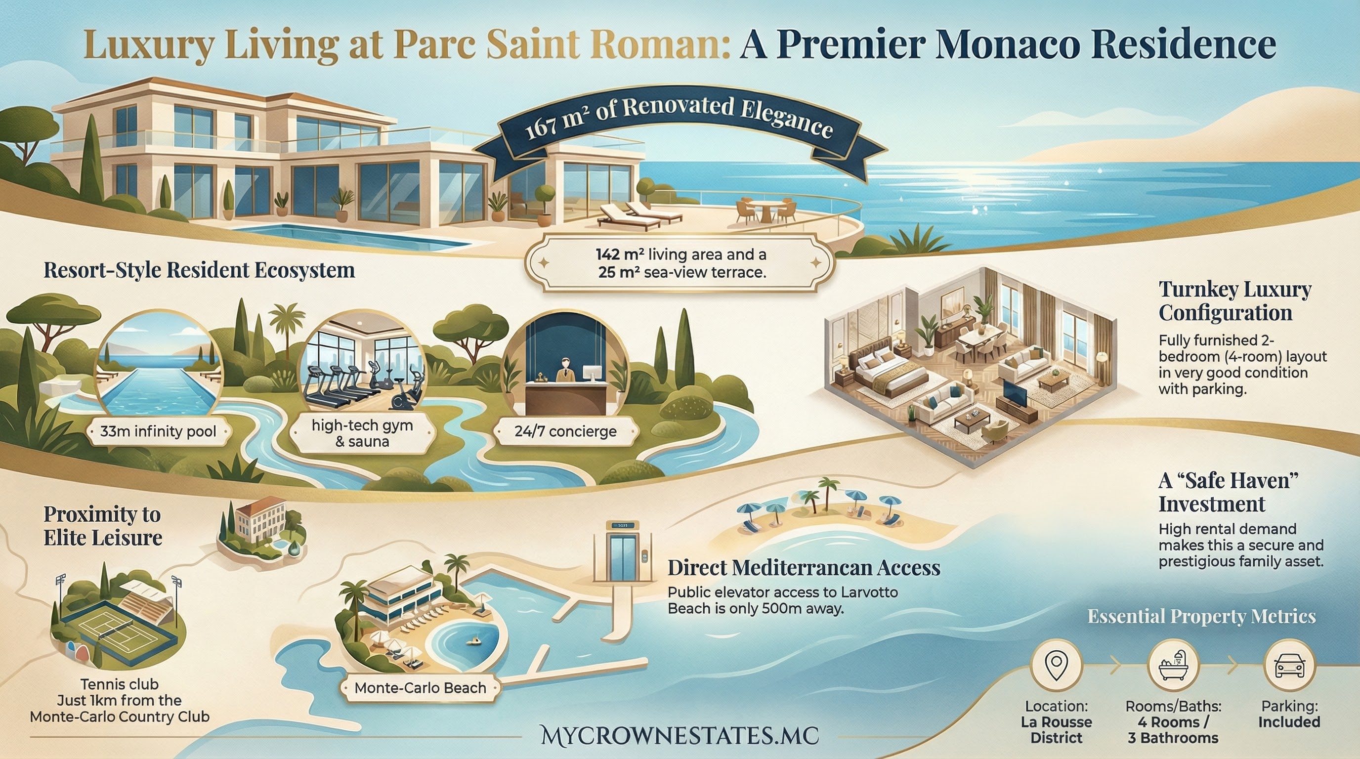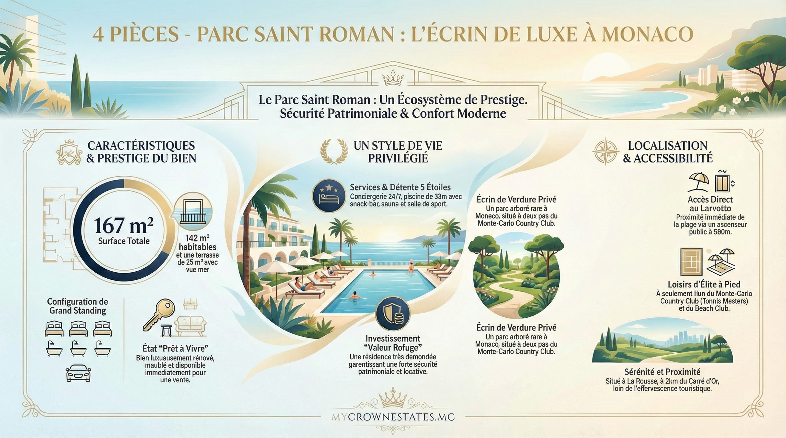 Situé à la pointe nord-est Monaco/frontière France, ce complexe de prestige offre vue mer panoramique et accès direct plage Larvotto via ascenseur public, à 1km Monte-Carlo Country Club (Masters ATP tennis) et Monte-Carlo Beach Club (plage privée/spa étoilé). La Rousse-Saint Roman incarne luxe familial serein : jardins verdoyants, immeubles standing, proximité Carré d'Or (2km) sans effervescence touristique.