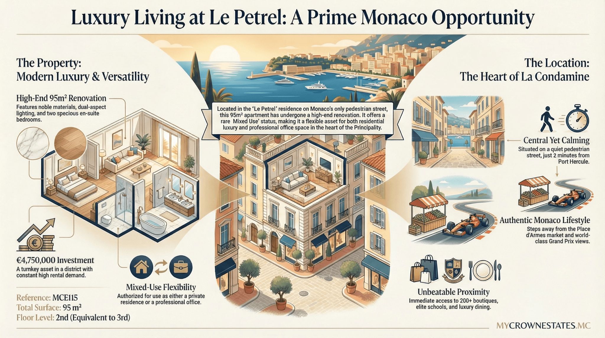 S’installer au Petrel au 21 Rue Princesse Caroline, c’est vivre au cœur de la seule rue piétonne de Monaco, dans une résidence moderne avec ascenseur entièrement rénovée, à 2 minutes du Port Hercule et 5 minutes de la Place d’Armes. Cette adresse emblématique offre une luminosité exceptionnelle grâce à ses étages élevés (2e étage = hauteur 3e), des terrasses sur rue animée et vue Rocher/Port depuis la plupart des pièces.