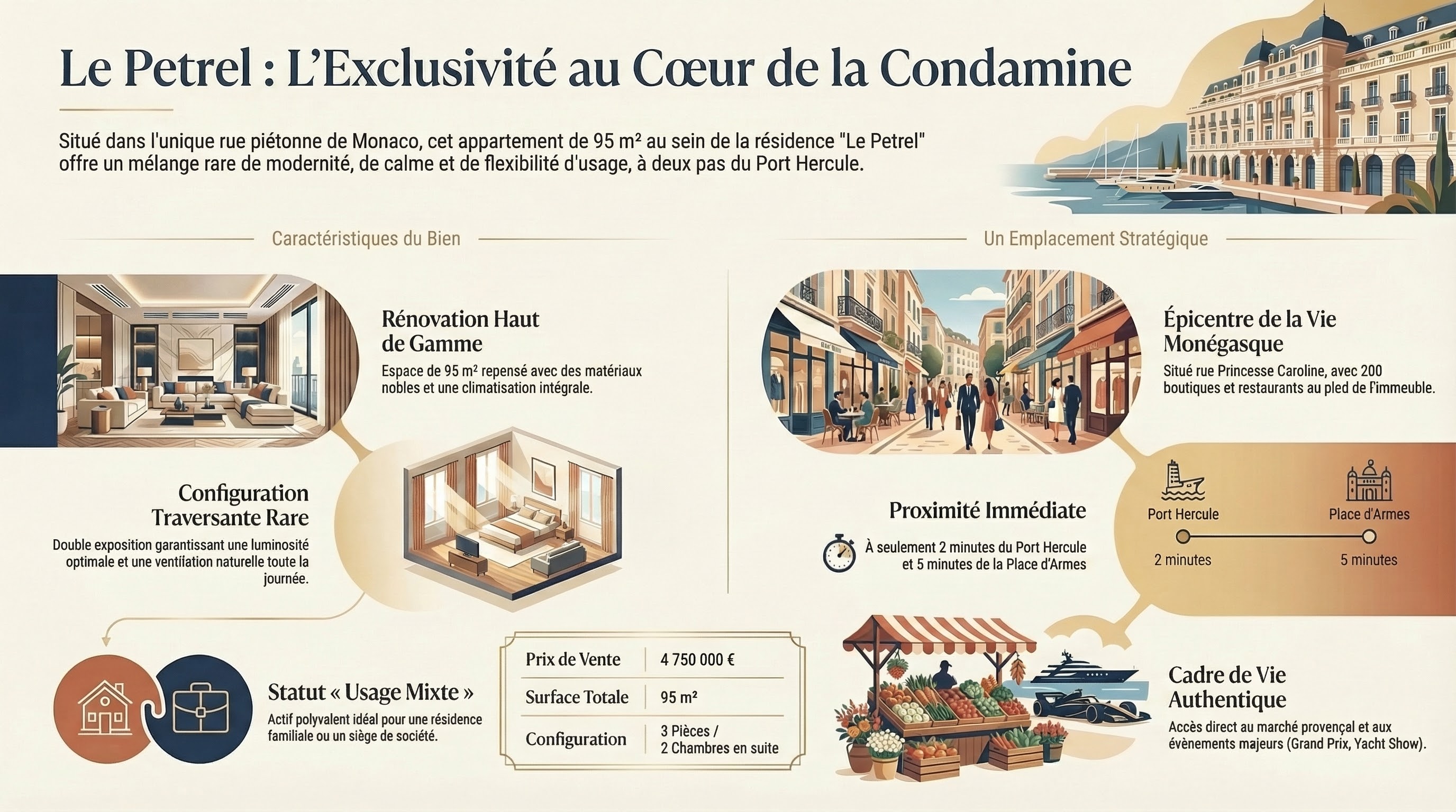 La Condamine incarne le Monaco authentique : marché provençal Place d’Armes, restaurants de la rue Grimaldi, quais du Port Hercule et ambiance villageoise animée par le Rallye Monte-Carlo, Yacht Show et Grand Prix. Rue Princesse Caroline concentre 200 boutiques, cafés et restaurants dans un cadre piéton sécurisé prisé des familles et professionnels.