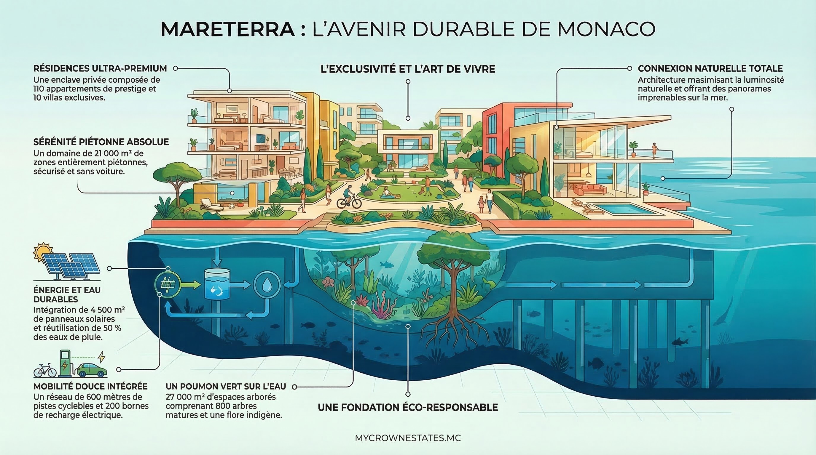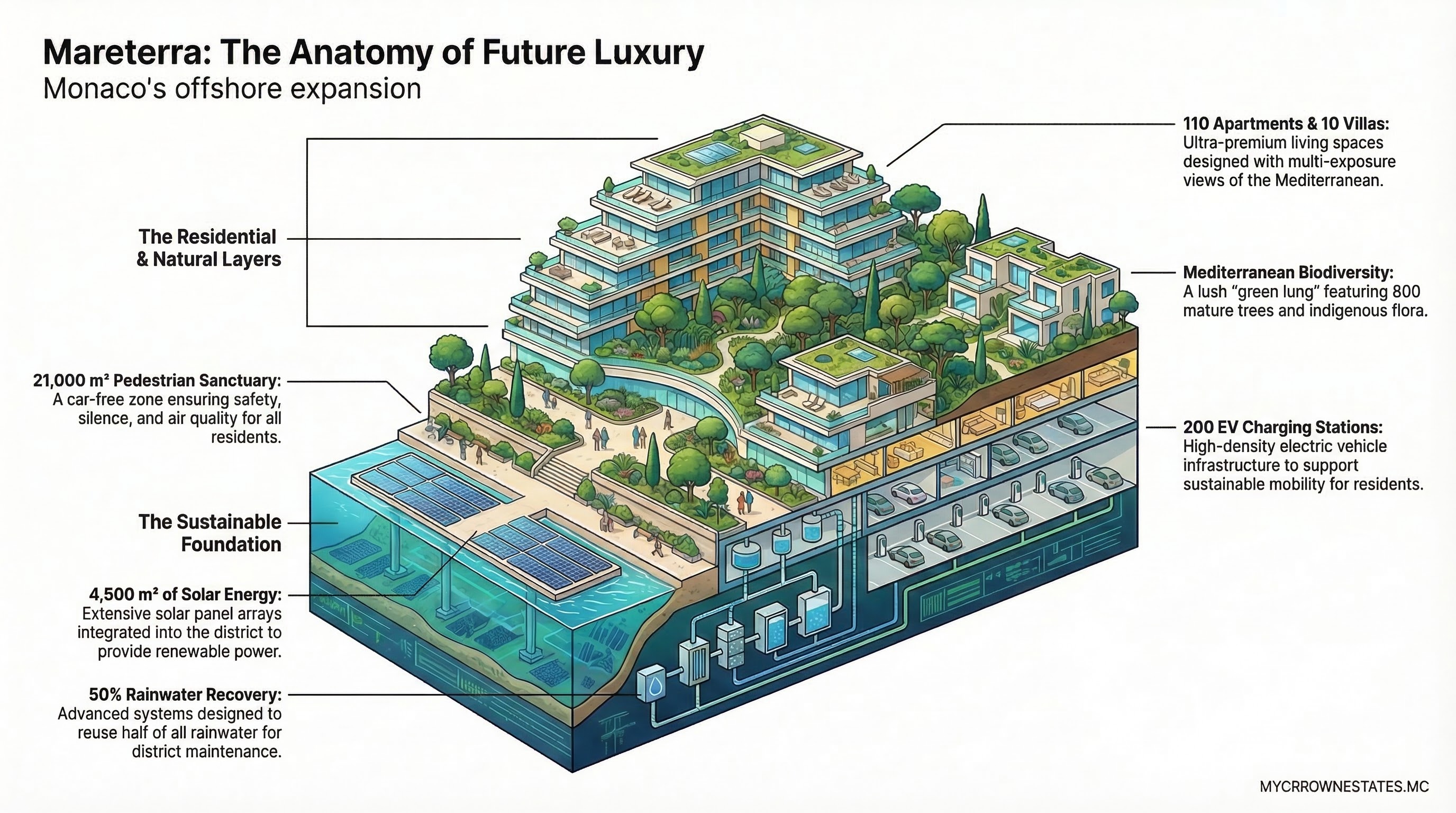 Au-delà de son esthétisme raffiné, Mareterra est une prouesse écologique. Le quartier intègre 4 500 m² de panneaux solaires, un système de réutilisation de 50 % des eaux de pluie, et une vaste infrastructure pensée pour la mobilité douce, incluant 200 bornes de recharge pour véhicules électriques, 21 000 m² de zones entièrement piétonnes et 600 mètres de pistes cyclables. C'est l'adresse ultime pour ceux qui recherchent un luxe absolu, responsable et tourné vers l'avenir.