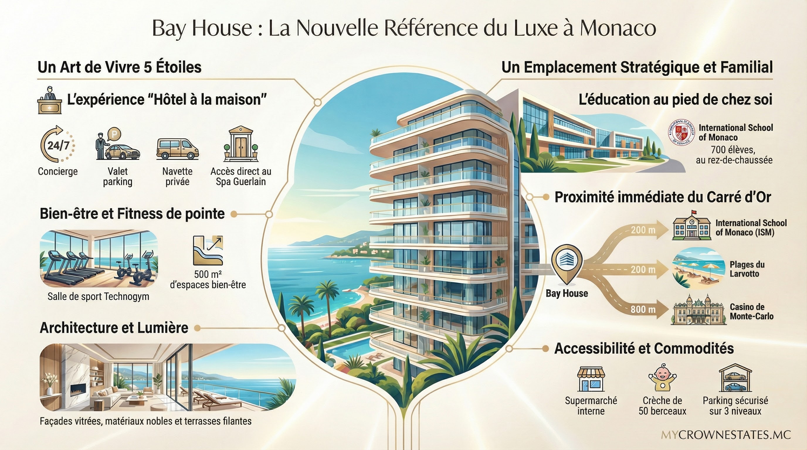 Habiter Bay House au 41 Boulevard du Larvotto, c’est vivre dans la résidence ultra-moderne livrée en 2024 (11 étages, 56 appartements + 5 villas roof-top), bénéficiant d’une conciergerie hôtelière 24/7, piscine privée, fitness interne et parking 3 niveaux avec ascenseurs dédiés. Ce projet Testimonio II offre des vues panoramiques mer Méditerranée plein sud depuis tous les balcons filants, à 200m des plages privées du Larvotto et 800m du Casino de Monte‑Carlo. Larvotto incarne le luxe balnéaire familial : plages, restaurants étoilés et International School of Monaco (ISM) au rez-de-chaussée de Bay House depuis septembre 2024.