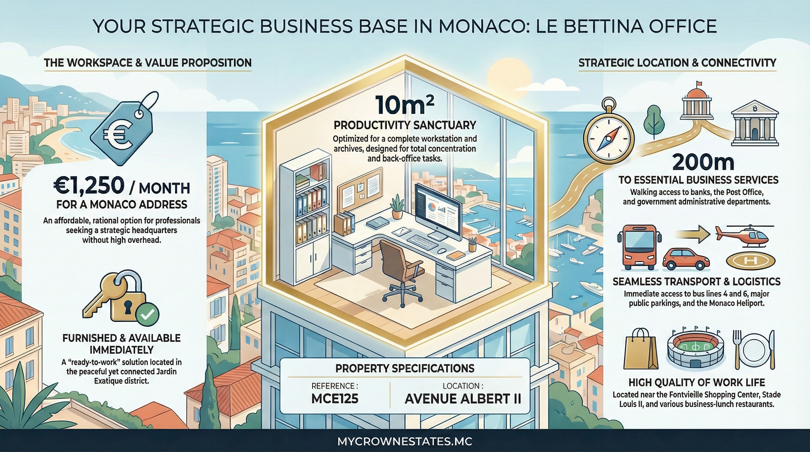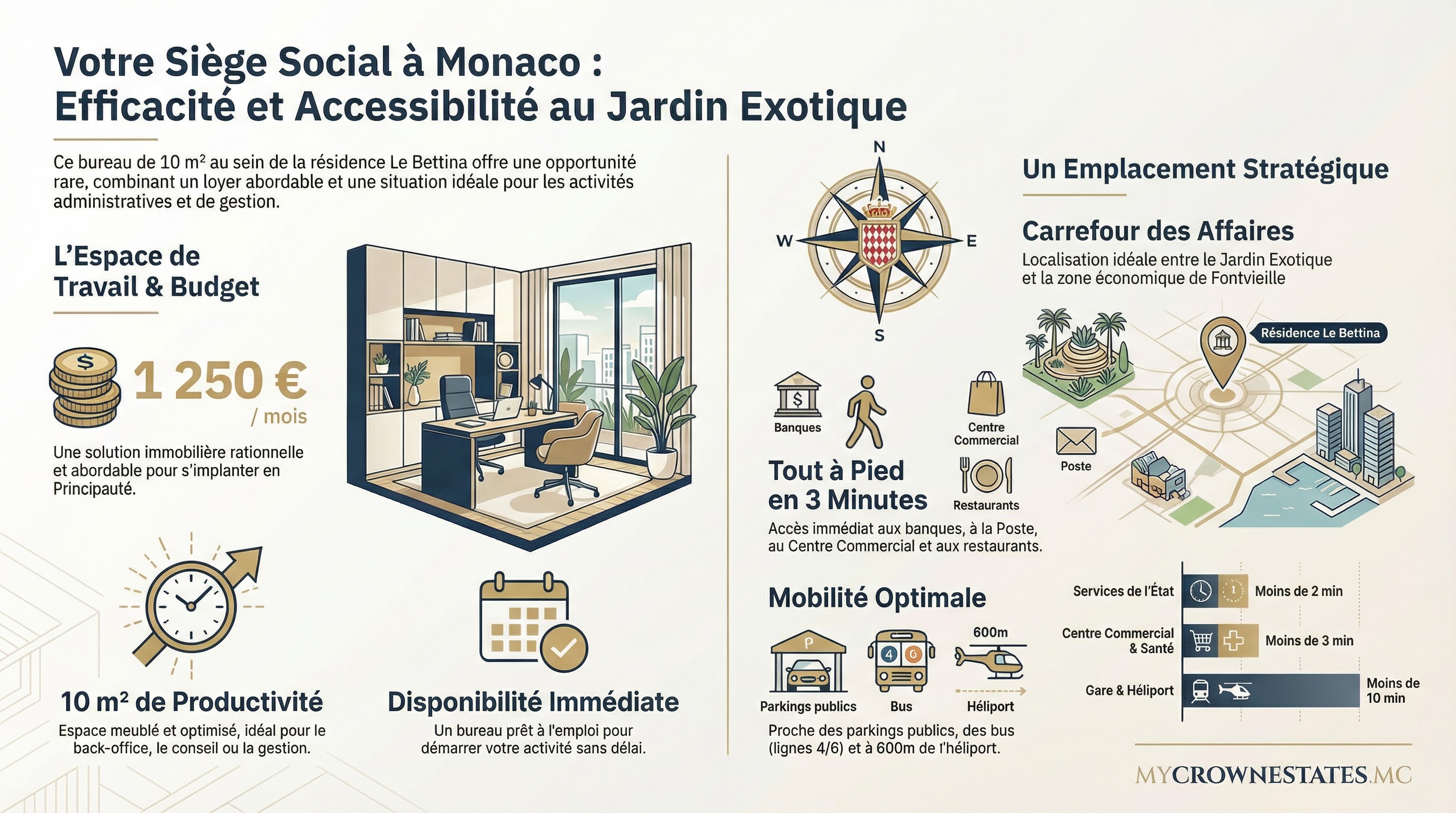 Situé dans le quartier calme du Jardin Exotique, ce bureau de 10 m² au Bettina est une solution pratique et fonctionnelle pour tout professionnel recherchant un pied-à-terre d’affaires à Monaco. L'espace est optimisé pour accueillir un poste de travail complet et des rangements dossiers. Son environnement "fermé" en fait un lieu idéal pour les activités de back-office, de conseil ou de gestion administrative nécessitant une concentration totale. Disponible immédiatement, ce bureau bénéficie d'un accès facilité aux transports en commun monégasques et à la sortie de la Principauté, offrant ainsi une grande flexibilité logistique au quotidien.
