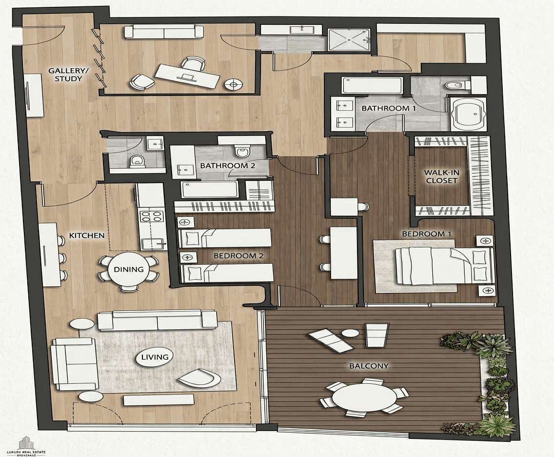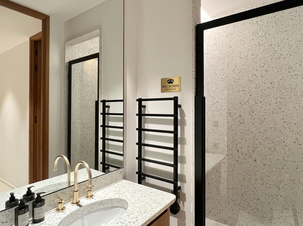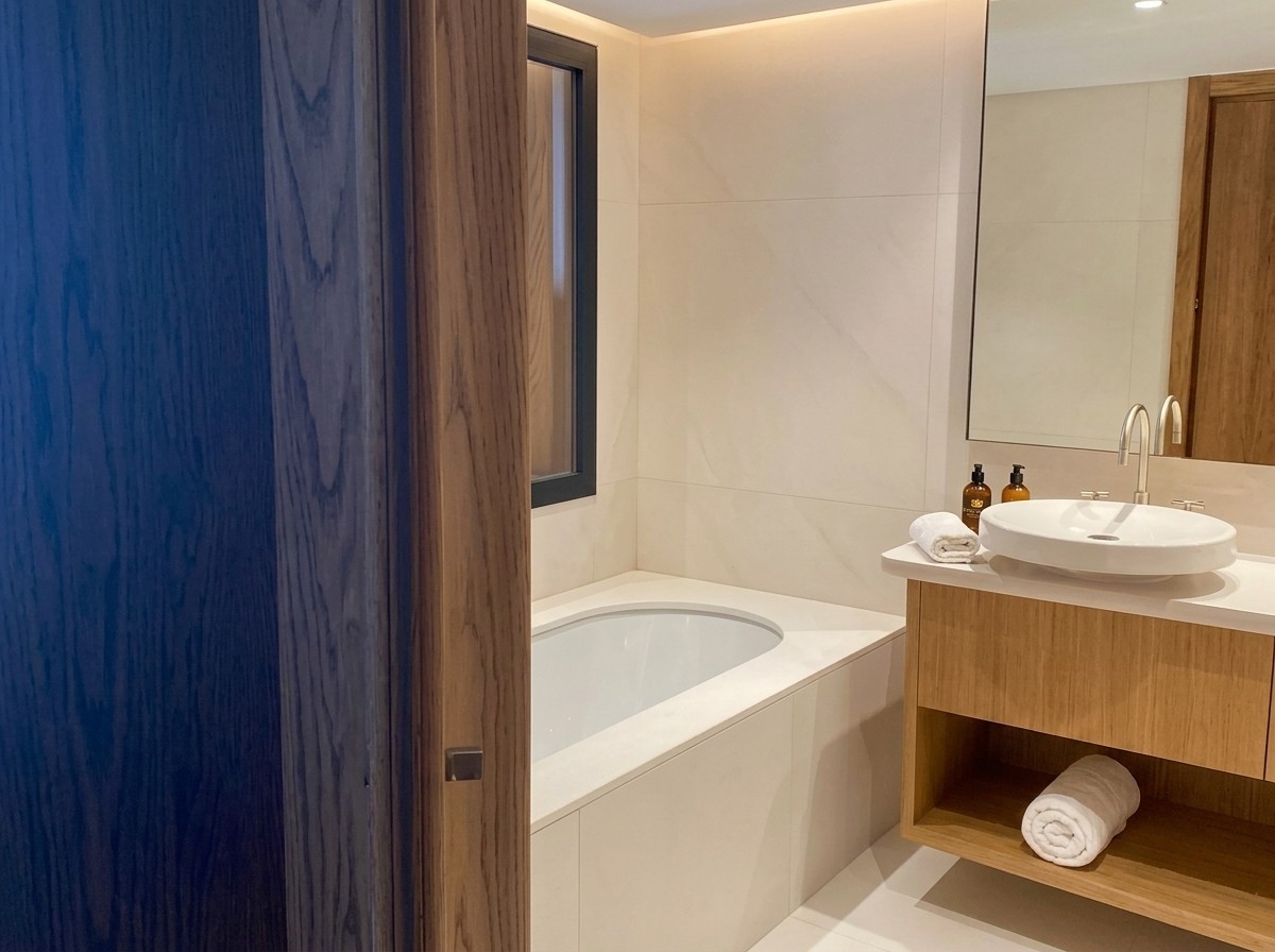 La partie nuit garantit une intimité totale avec deux superbes chambres dotées de leurs propres salles de bains privatives. Un bureau dédié, également équipé d'une salle de bains attenante, offre une flexibilité parfaite pour accueillir des invités ou aménager un espace de travail professionnel luxueux. L'appartement dispose de prestations de très haut standing : toilettes invités, buanderie indépendante, climatisation, systèmes de sécurité avancés et fenêtres coulissantes.