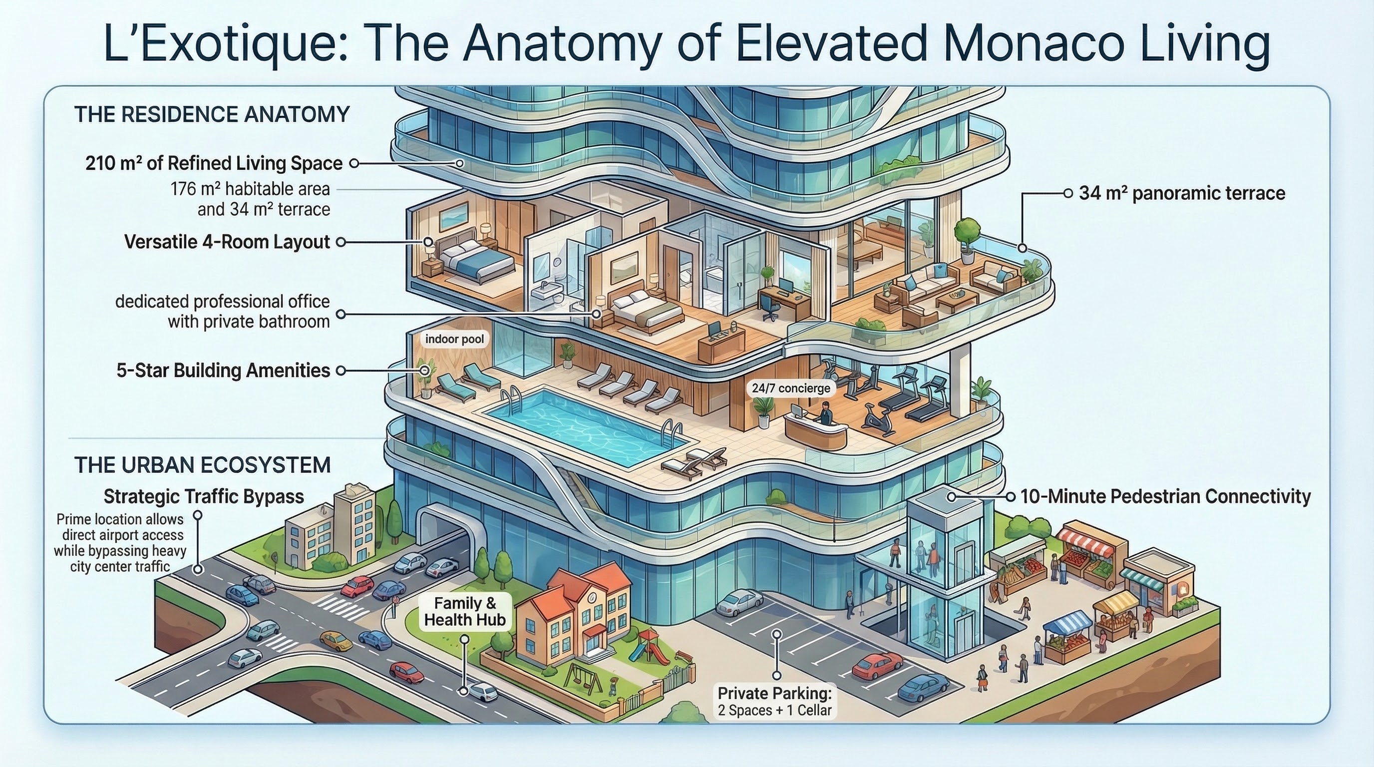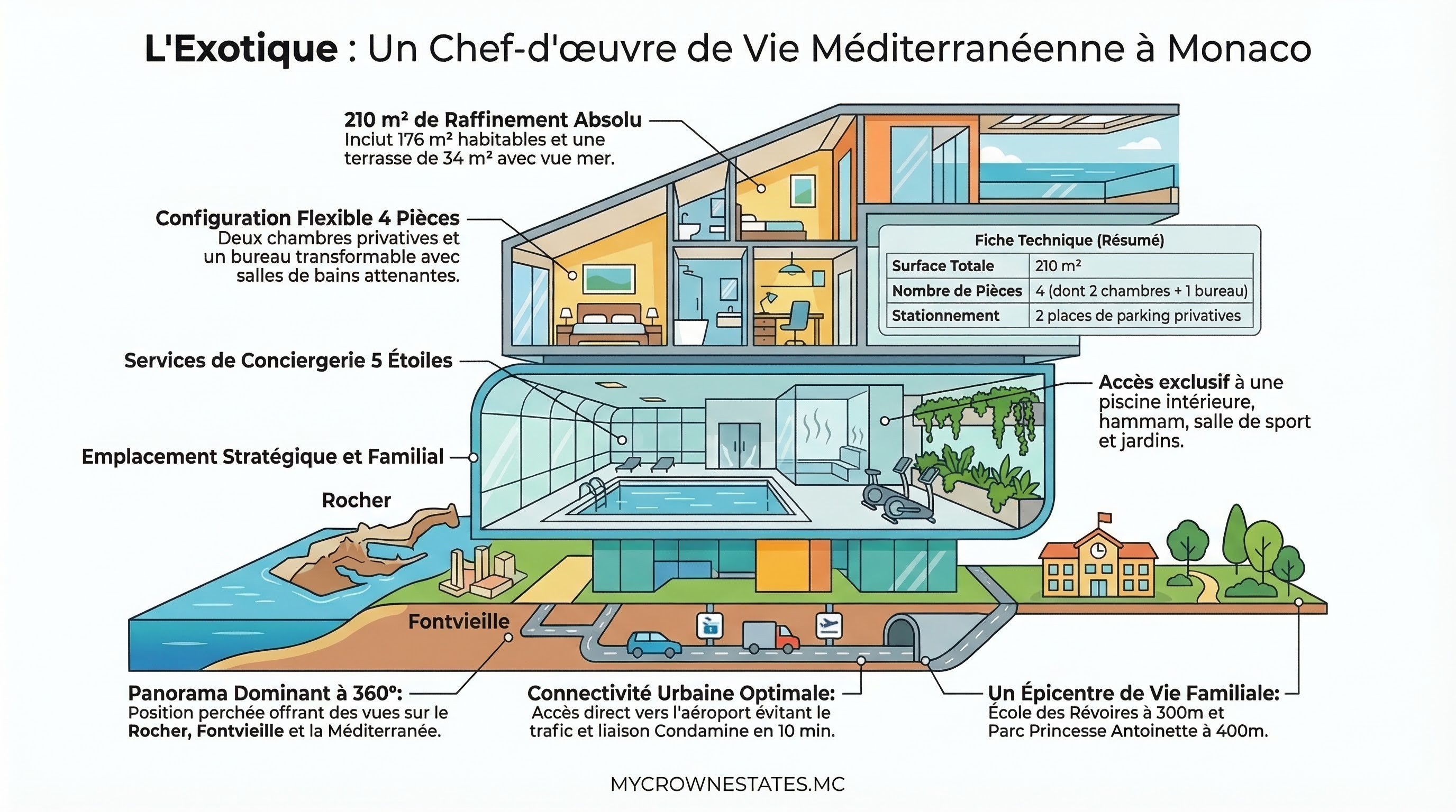 Situé dans le très convoité complexe "L'Exotique", ce luxueux appartement de 4 pièces déploie 210 m² de surface totale, dont 176 m² habitables soigneusement conçus pour allier confort absolu et raffinement. Grâce à ses vastes baies vitrées, les espaces intérieurs sont baignés de lumière naturelle et s'ouvrent sur l'extérieur de manière fluide.