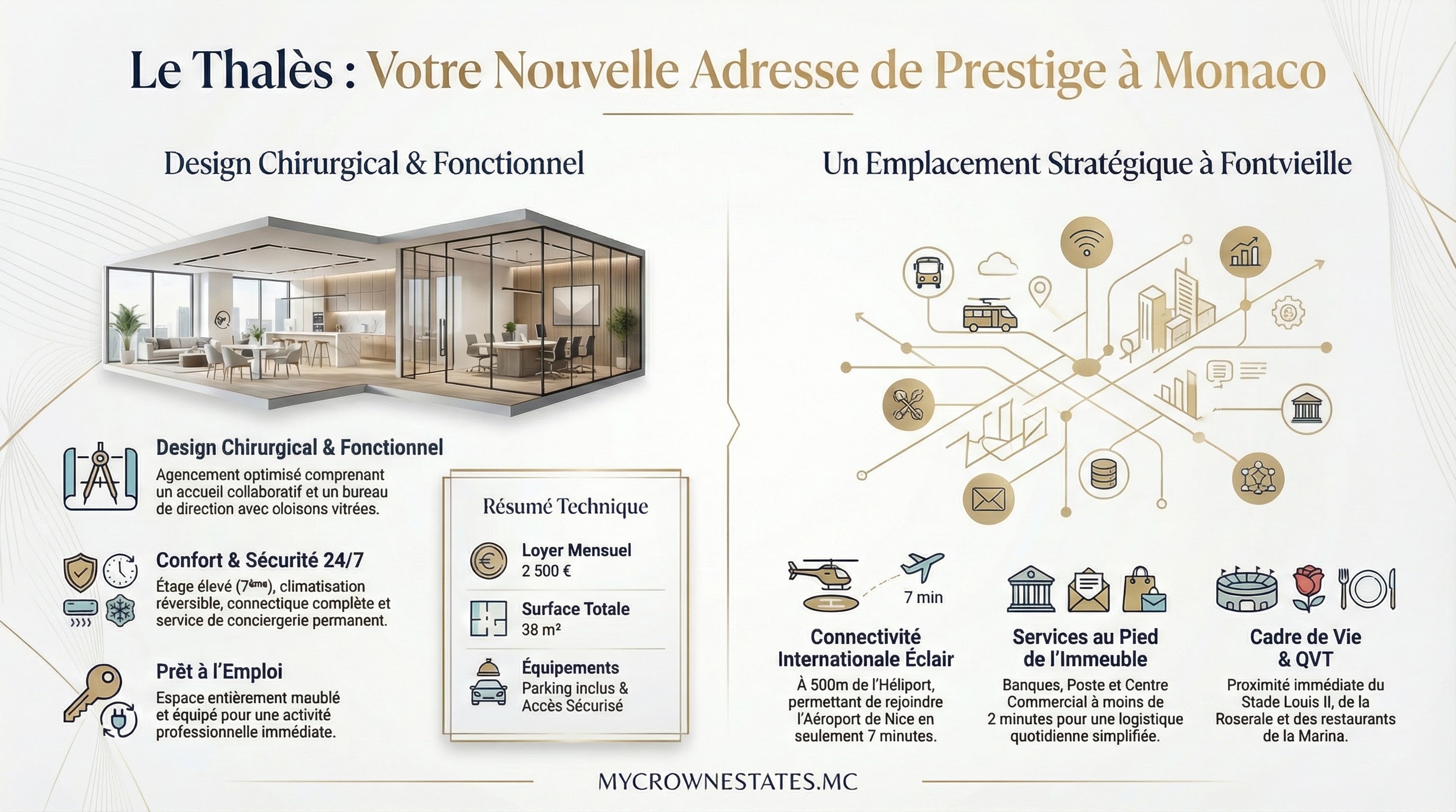 Connectivité & Hub d'affaires : Synergie immédiate avec les nombreuses entreprises du quartier et accès à l'Aéroport de Nice en 7 minutes via l'Héliport de Monaco (à 500m).