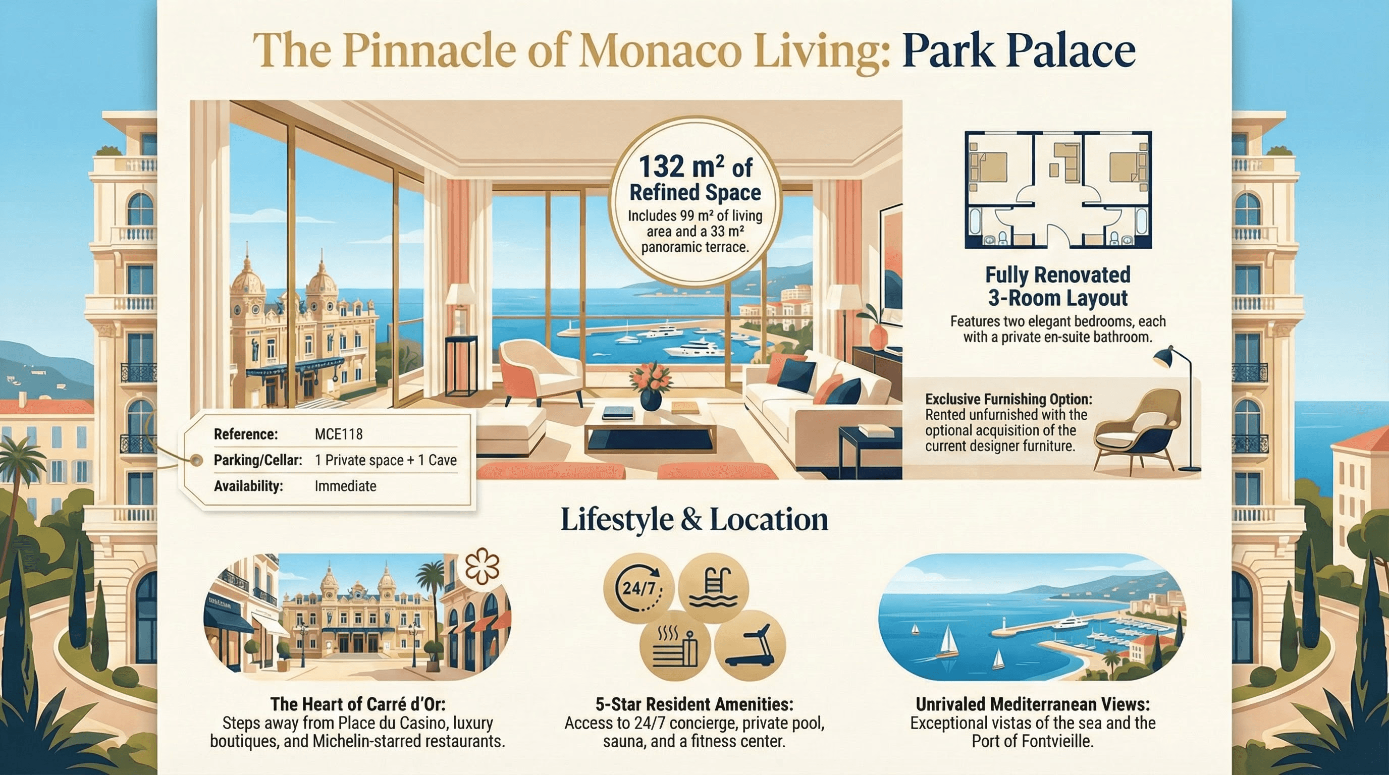 Situé dans la très prisée résidence du "Park Palace" en plein cœur du Carré d'Or, cet appartement de 3 pièces de 132 m² vient de bénéficier d'une rénovation intégrale alliant élégance contemporaine, matériaux raffinés et attention méticuleuse aux détails. L'espace de réception, baigné de lumière grâce à sa belle exposition (Sud-Est-Nord), s'ouvre sur une généreuse terrasse de 33 m², offrant un panorama magnifique sur la Méditerranée et l'effervescence monégasque. L'espace nuit est pensé pour le confort absolu : deux chambres élégantes, chacune disposant de sa propre salle de bains attenante. Les résidents bénéficient d'un style de vie exclusif grâce aux équipements haut de gamme de l'immeuble : service de conciergerie 24/7, piscine, salle de sport entièrement équipée et sauna. Une place de parking privée et une cave viennent parfaire ce bien hors du commun.