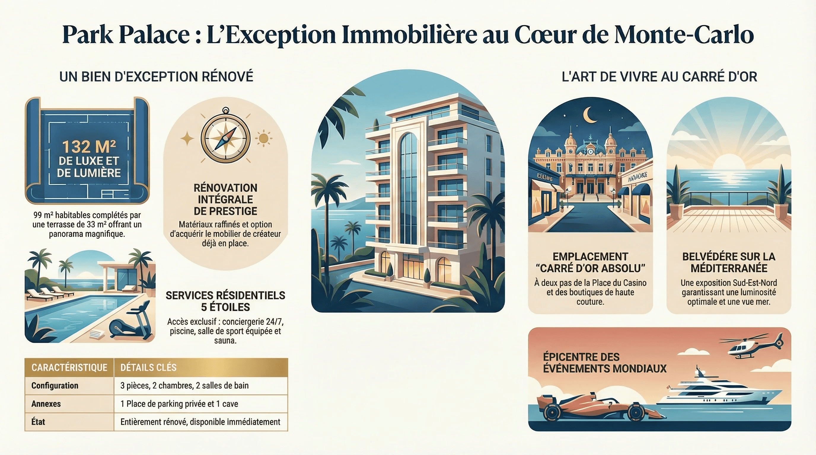 Habiter le Park Palace, c’est s’installer avenue Princesse Grace, au cœur du Carré d’Or, à quelques pas de la mythique Place du Casino et du bord de mer, dans l’un des quartiers les plus prestigieux de la Principauté. Cette résidence emblématique offre une vue panoramique sur la mer Méditerranée et le port de Fontvieille, dans une atmosphère cosmopolite où se croisent yachts, voitures de collection et événements internationaux. Monte‑Carlo incarne l’élégance monégasque : luxe discret, animation raffinée et accès immédiat aux plus belles adresses de la Côte d’Azur.