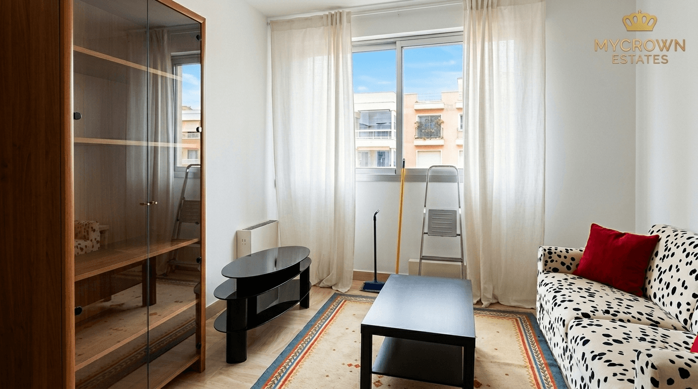 L'espace de vie de 25 m² est optimisé pour offrir un aménagement fonctionnel et confortable, comprenant une salle de bains. Depuis sa position en étage élevé, l'appartement dévoile une belle vue dégagée combinant l'architecture de la ville et le bleu de la mer Méditerranée.