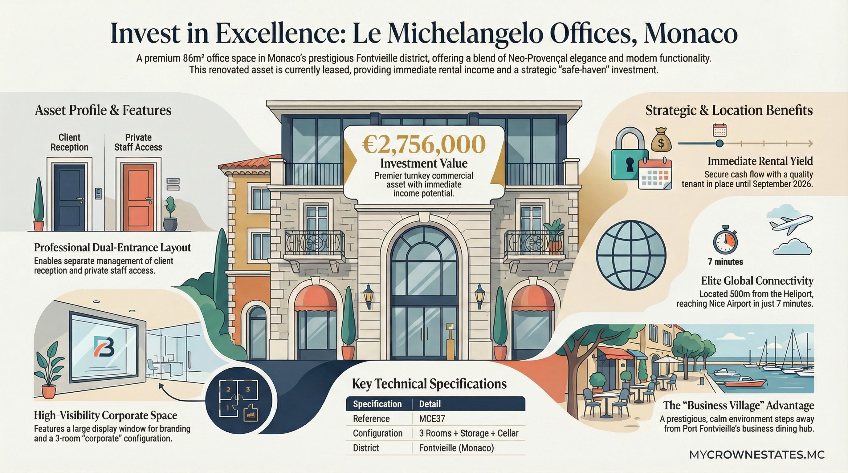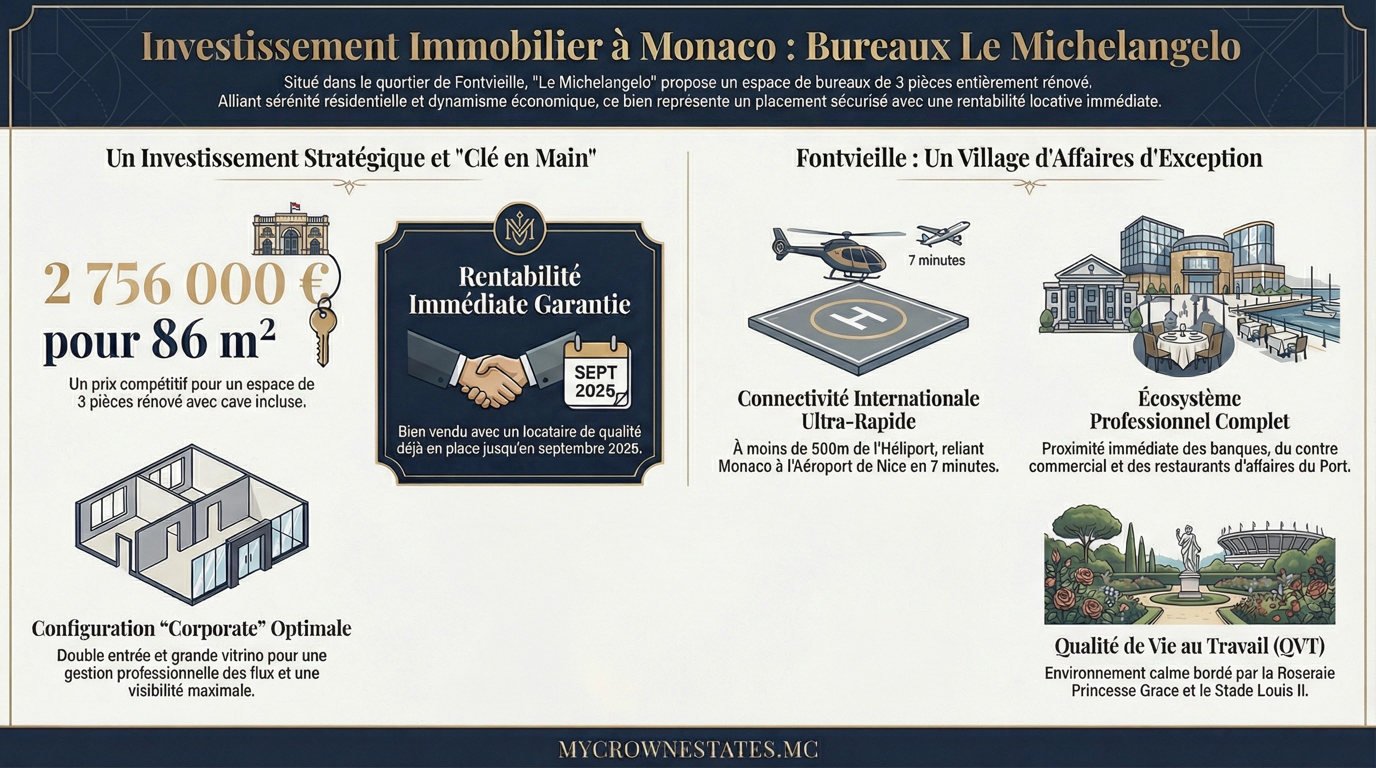 Acquérir des bureaux au sein du Michelangelo, résidence de grand standing reconnue pour son élégante architecture néo-provençale, constitue une opportunité patrimoniale rare en Principauté. Que ce soit pour y établir le siège de votre société ou pour réaliser un investissement locatif à forte rentabilité, ce 3 pièces offre un cadre à la fois prestigieux, fonctionnel et serein. Le quartier de Fontvieille séduit les investisseurs par son atmosphère de "village d'affaires" paisible, combinant la proximité immédiate des centres de décision monégasques, une logistique urbaine maîtrisée et une qualité de vie au travail (QVT) exceptionnelle pour vos équipes.